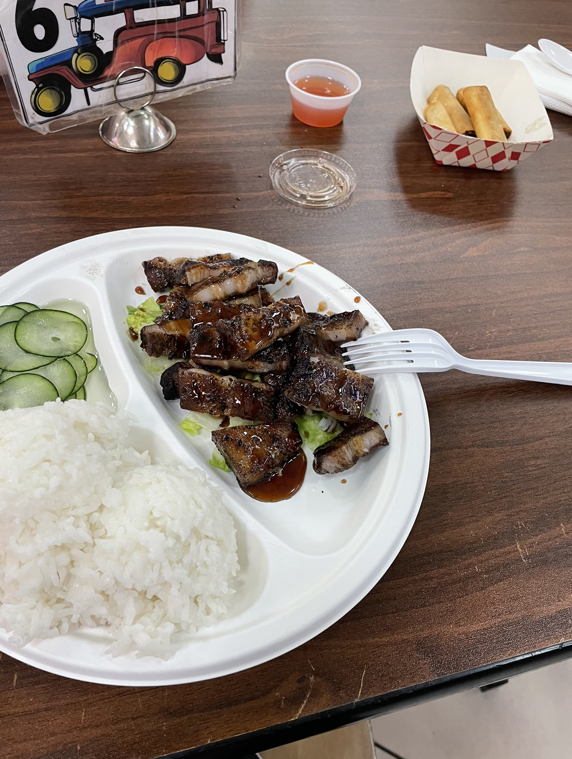 Ā Ā Ā Read moreMy first time eating at this place and was happy to find food close to home. However, I was kind of disappointed. Our food took a while to arrive. I ordered the BBQ Skewered Pork and the meat tasted just like home. But my rice was on the "fachi" side (Chamorro for wet) and the macaroni salad was pretty good. The foods that were ordered by the others in my group, like the dinigu'an (Filipino for fresh pork stew) and the Crispy Pata (Filipino for crispy pigs feet) were not what we expected it to be. The dinigu'an was not authentic and the Crispy Pata was unpleasant). I would recommend maybe just the BBQ meat like the pork and chicken. Other than that, I will not recommend this place also, if you are in a hurry to get to your destination. We waited for about 30 minutes...