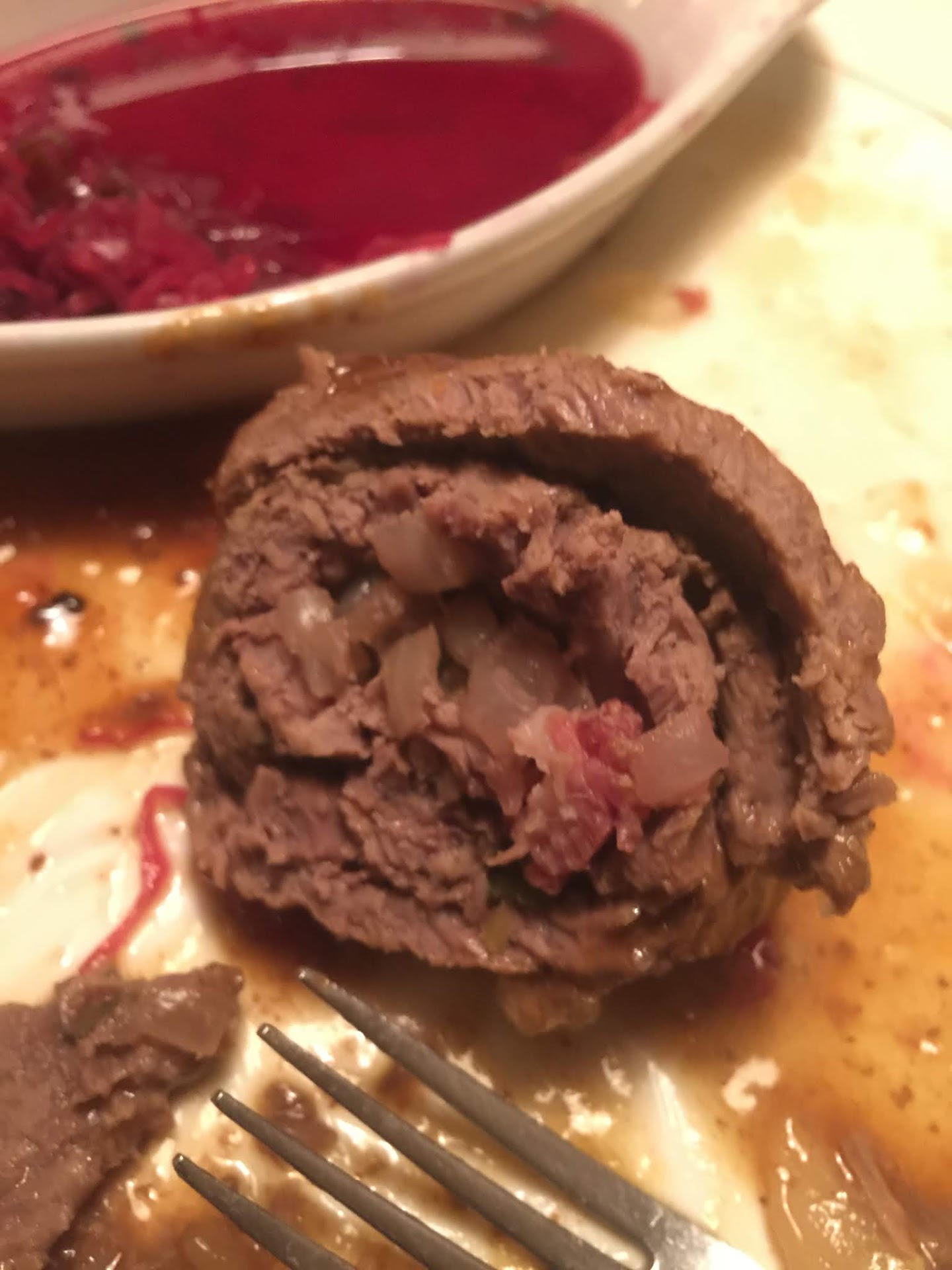 Our meal arrived in due time, and looked scrumptious. The beef roll was large and sat under a light brown gravy. I would have enjoyed a bigger portion of potato salad, but the bowl of cabbage made up for it. The meat had a mild taste and great mouth feel, almost like it shredded itself as I chewed. The roll was quite thick, and at first I was worried that it might not be cooked all the way through. My fears were for naught as I saw no redness at all working my way through it. There were onions and spices in the middle of the roll, which gave it flavor from the inside out.