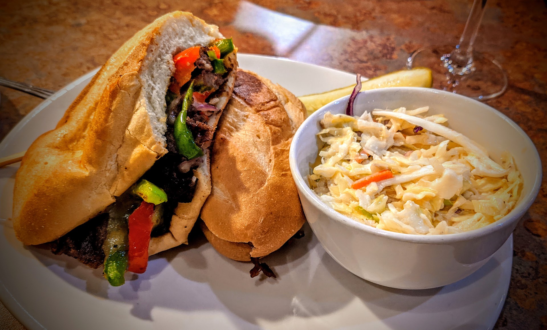 Sunday evening, we three supped at the "club." "What's the club? I asked. Turns out another Ponderosa ranch building at Sun City. Circling the lot no cars were parked. "Is it closed?". Street lamps and outside walk lighting were extinguished. Then under the starry sky we espied a half dozen cars. Walking across the drive we carefully negotiated unlit curb and stairs with black handrails. Entry doors were unlocked so we entered a large dining hall spanned by wooden trusses. The perimeter was lined with deep wooden booths to seat six per bench. Circular and rectangular tables of varying heights and size filled the hall in view of large screen TVs showing programming for various tastes. Seated at first around a seven seat round table, our waitress, Maria, accommodated my wish to try the booth which allowed an extra three inches for my ample girth and intimate face to face private conversing. The menu was limited with few entrees, twice as many sandwiches, salads. The soup du jour was cream of broccoli liked by our "dieter" who ordered a Reuben. The men opted for salads with the signature sandwich and fish and chips which came with Cole slaw and tartar sauce. Without asking Maria provided malt vinegar and ketchup. The whitefish were battered and the chips here normally served wedged. Maria announced the potato options and substituted slaw to go along with the Reuben and pickles. Salads come in petite pricing. The small chef salad was a meal in itself with a quarter a peck of tiny tomatoes which were spooned with a creamy-thick balsamic vinaigrette. We were glad the sandwich course were proportionate after the filling beginning. For dessert a chocolate cake and cheese cake served with scoops of vanilla ice cream matched my gingerbread carrot cake. As we left external illumination was on. It's timer probably needs resetting as winter solstice is less than a week away and old folks like us don't see as well at night. One last thing if you want good fish and chips try any workman's pub in any Scotland or Britain town or hamlet: served in tabloid newsprint unbattered cod chunks and crinkle cut potatoes. First January Monday visited 1880 Grille again. Had Asian Chicken petite salad, a variety of shredded cabbage, sliced cucumber, Mandarin Orange sections, garnished with two types of noodles and diced chicken. The Asian salad dressing was very thick and sweet dreams. Had also ordered a Philly Cheese Steak sandwich with a side of Cole slaw. A baby gerkin and dill spear garnished the plate. But the salad, small as it was, filled the stomach so doggy bags...