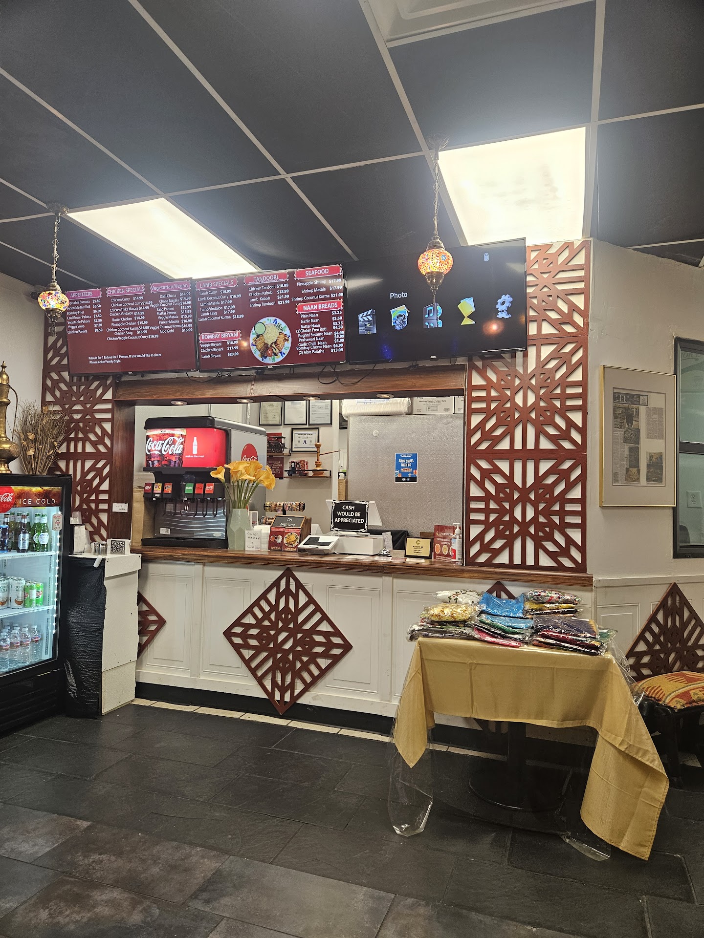 The Ambiance-- Upon entering the restaurant I was greeted with a very faint aroma of Indian spices, which surprised me as I am used to smelling those aromas strongly in this type of establishment. This location is a tiny place with indoor seating for approximately 15-20 at max. The dining room was kind of dingy, but not dirty. In one corner of the small dining room, there were some items of Indian and/or Pakistani origin for sale which I found a bit odd given the size of the restaurant.