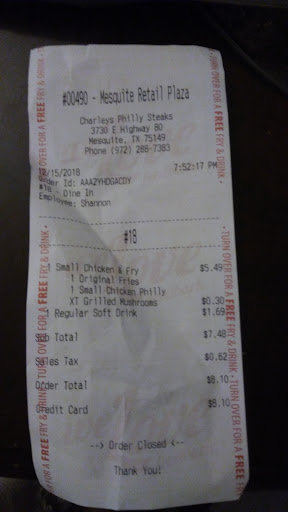 I pulled up to this location and was shocked to see a Charley's out side of a mall but more so to see an employee smoking right in front where customers are approaching. As we, myself and the employee were going in, another employee was going out the door to smoke, I was shocked! My excitement went to; I am just not sure about this, but I was starving at this point. I went to wash my hands and come to the counter to place my order I must have been there for at least two minutes before anyone came from the back. The female employee finally came to the register and took my order, I asked if she was the cook and she said no, she said that he is the cook, I looked back he was just coming through the door after his smoke. I asked the male cook if he would please wash his hands before preparing my food he did. I watched him prepare my food and was appalled by what I saw. He placed one piece of meat on the grill and very minimal toppings to go on the sandwich. I ordered a chicken Philly cheese with a side fries which was a total of $5.49. I ordered extra mushrooms on my sandwich and it was to my surprise that he took out a few sprigs and put it on my sandwich and I was very hurt when I got my food!! The sandwich look nothing like the sandwiches I would get in the mall it was very small more so like a kid's meal and when I asked him about it he told me well the owner of this establishment proportions out the food and this is how the sandwiches are made. I then realized that this is a franchise and that's why this Charley's is outside of the mall but at the same time you have to accommodate for the customers especially if they pay for extra toppings. I did not get my money's worth and I was very very unhappy and if you do decide to visit this Charley's, consumer beware!! On my way out I picked up my trash and went to dump it and looked over and saw that the trash can was over fillling to a point where the door could not be closed so I left my trash on top of the trash bin and walked out!! So I am giving this particular restaurant a 0 all the way across the board. I will not be visiting this store again! It is to your discretion how you spend your money and where you want to spend it. I ate in the store and realized it was getting colder the longer I stayed. It was my first and last time, I will not be returning to this particular store. Over all customer service 1, cleanliness, 0, restaurant atmosphere 0, satisfatiction 0, food was cooked fresh, 5, portion...