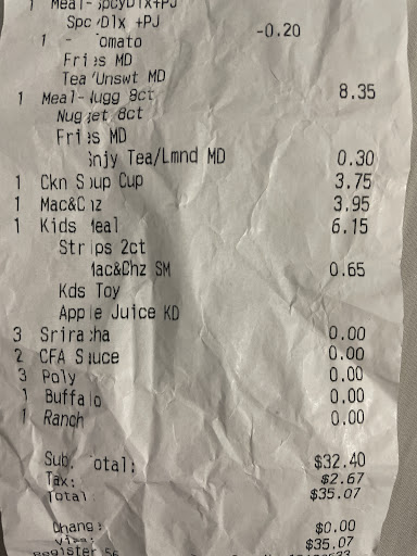 Read moreI wished I had taken pictures but the food didn't last long enough... LoL so at this location I guess I got there before the crowd showed up but the lines were extremely short. I had placed my order through the app. Now mind you that I haven't been to a Chick-fil-A in a long time (pre covid time) but for some reason I wanted to give it a try. Everyone at this location was very friendly and extremely helpful and made my visit hassle free and they have their stuff down like a well oiled machine. As far as the food. I will start out by saying that the chicken nuggets were very salty for my taste and I don't remember them being that way in the past. I ordered a bottle of their honey mustard sauce and I'm using it on everything... LoL. The frozen coffee was delicious and the Mac and cheese was the star of my meal. It was creamy yet that extra gooey stringy cheese mixed in was just like my mom used to make and I'm glad that I ordered two and my sister didn't want hers. I would buy a big pan of the Mac and cheese and dare anyone to try to touch it. They need to let us be able to order different sizes of it. This was a very great experience and I will be back even if it's just for the frozen coffee and...