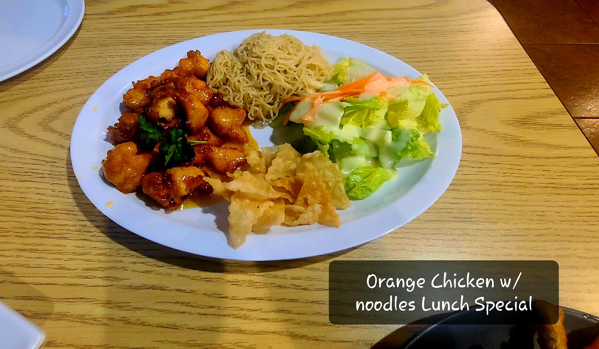 My husband’s orange chicken hit the sweet spot—literally. Not overly sugary, but just enough to satisfy his sweet tooth. The lunch special included a generous portion of tempura chicken, a side salad, and egg noodles (his choice), plus crispy fried wonton strips for that extra crunch.