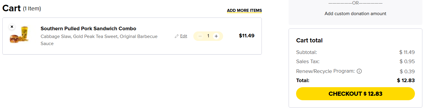 Online price versus drive-through price. Screenshot #1 displays the online pricing for a pulled pork sandwich, side, and Big Yellow drink, including tax and a recycling fee of $12.83. The second screenshot shows the price paid at the drive-through of $15.14, with taxes, and without a recycling fee. I also had a Value-Pak coupon for a free pulled pork sandwich with the order of any sandwich combo meal. Online $8.99, same as on receipt, and amount discounted. The total difference of $2.31 more ordering in the drive-through versus ordering online. What would I have paid if I had ordered online for pickup?