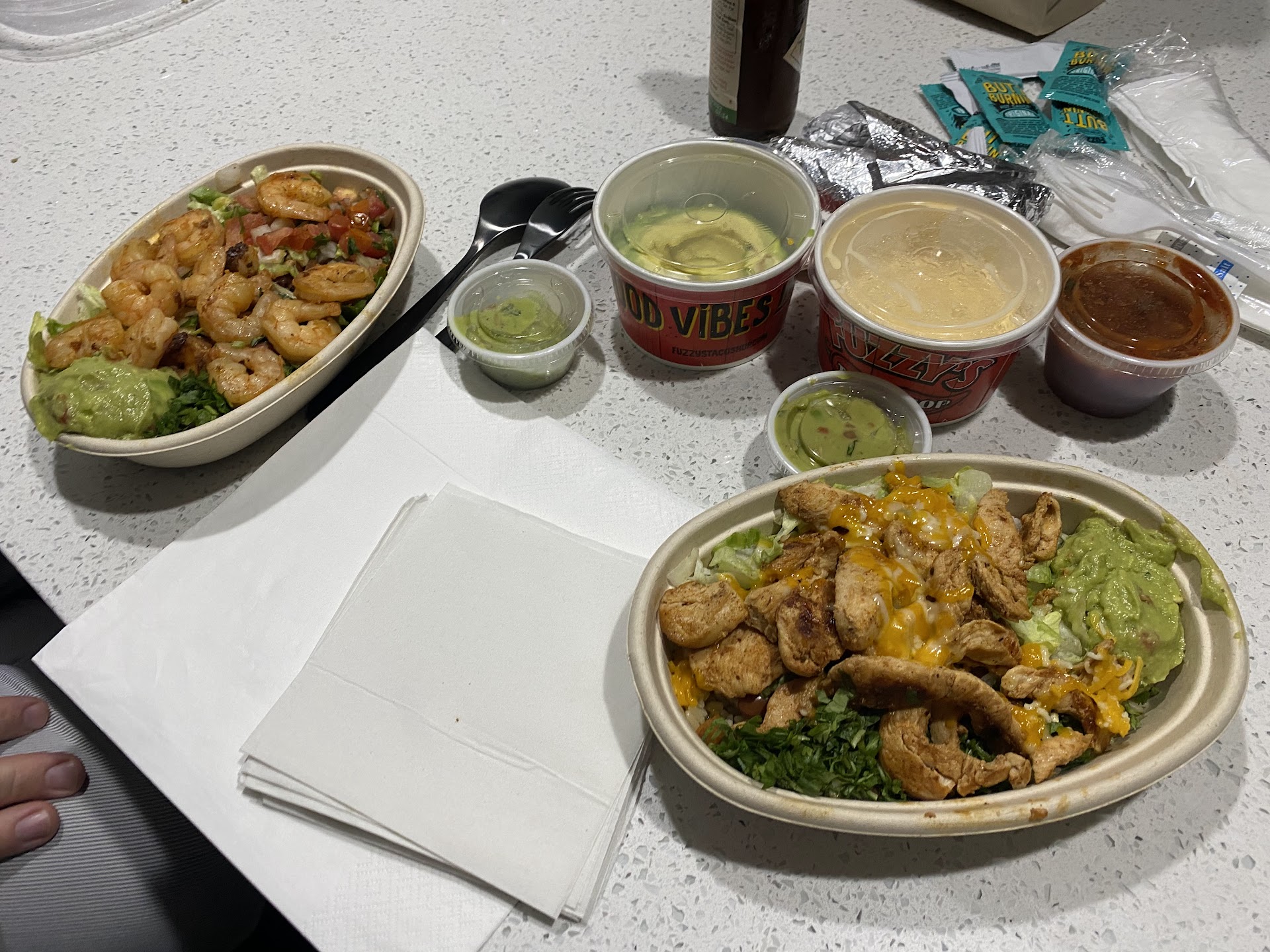 On 11/12/20, we ordered two burrito bowls (shrimp and chicken fajita), queso, guacamole, side of avocado, fish taco, and a Blue Moon for curbside pickup. Let’s just say curbside pickup didn’t happen and fiancé had to go inside to get our food. The two bowls were smaller than Chipotle’s bowl and in my opinion not as good as theirs. I had the chicken fajita and the meat was dry, over cooked, and bland. There wasn’t much rice or beans and just a sprinkle of cheese on top. Fiancé’s bowl looked about the same, but his shrimp did appear better. He said that the bowl was alright. I didn’t finish eating my bowl. It was disappointing. The side of avocado was generous and the salsa was pretty good. Queso was okay and nothing to write about. Fiancé fish taco had cheese when he requested no cheese. Next time we’re just gonna get tacos at Fuzzy’s. They’re...