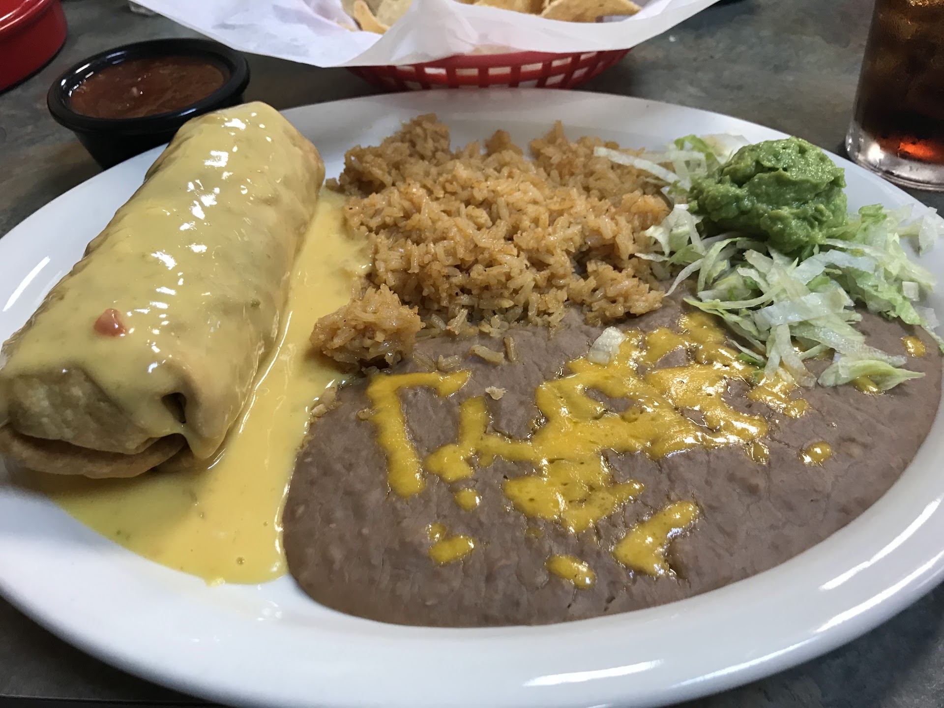 We entered the building and I was surprised how big it was. I was expecting something smaller, but anyways, we were promptly seated. Our server, Elsa, brought us warm chips and salsa and asked what weād like to drink. My friend and I finally decided what we wanted to eat and placed our order. When the food arrived, it was hot and was exactly what Iād been craving! I ordered the chimichanga with beef fajita meat and it was fresh, tender and seasoned perfectly. My friend ordered enchiladas with extra tortillas and also loved his meal.