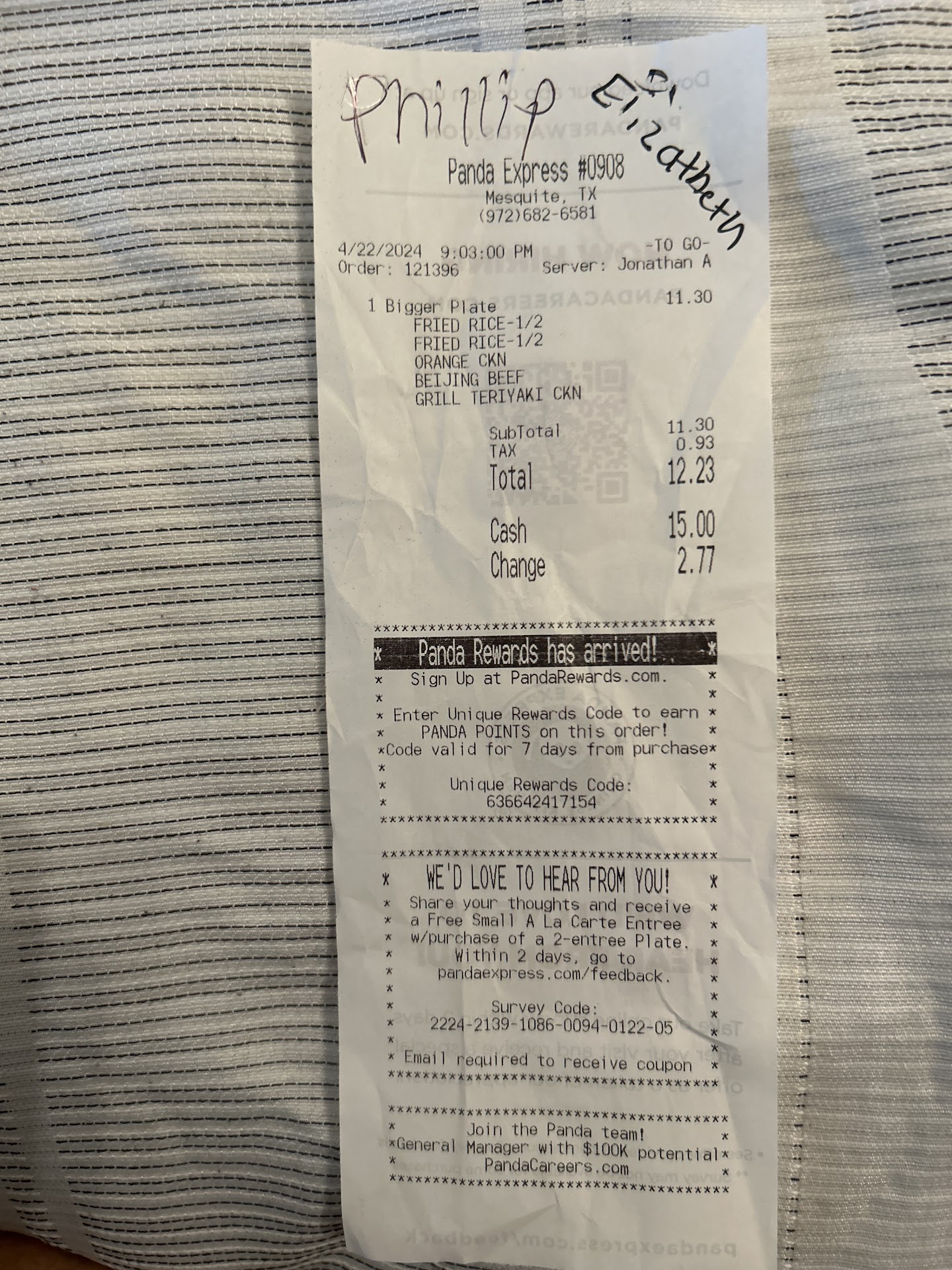 Read moreI am very new to the Dallas area and I came into this Panda Express in Mesquite on 4/22/2024 around 8:55pm. There were only two customers and they were already seated and eating. There was a Hispanic guy in front of me and his ordered was taken by the worker Phillip (Hispanic male- they refused to provide his last name). After he took the Hispanic guy’s order and he went to pay, it was my turn to place my order. Instead of Phillip helping me, he immediately started making to-go plates while completely ignoring as I am standing. After about a minute, I spoke up and asked why is he not taking my order; he still ignored me. There were several Hispanic workers and one came over to take my order. I was extremely upset. Another Hispanic male while into the restaurant and Phillip went over and took his order immediately. This was for sure a racially motivated act. He had absolutely no reason not to serve me. I never been in that location, I have never seen him, he’s a RACIST who shouldn’t be working there. I also spoke with the manager on duty that night. Today (4/23), I spoke with another manager, Elizabeth. He ONLY served Hispanic customers and his RACISM was caught on camera. I encourage Elizabeth to review the camera which would show his racism. I’m also calling corporate. There’s absolutely NO ROOM for racism in our society! He need to be coached...