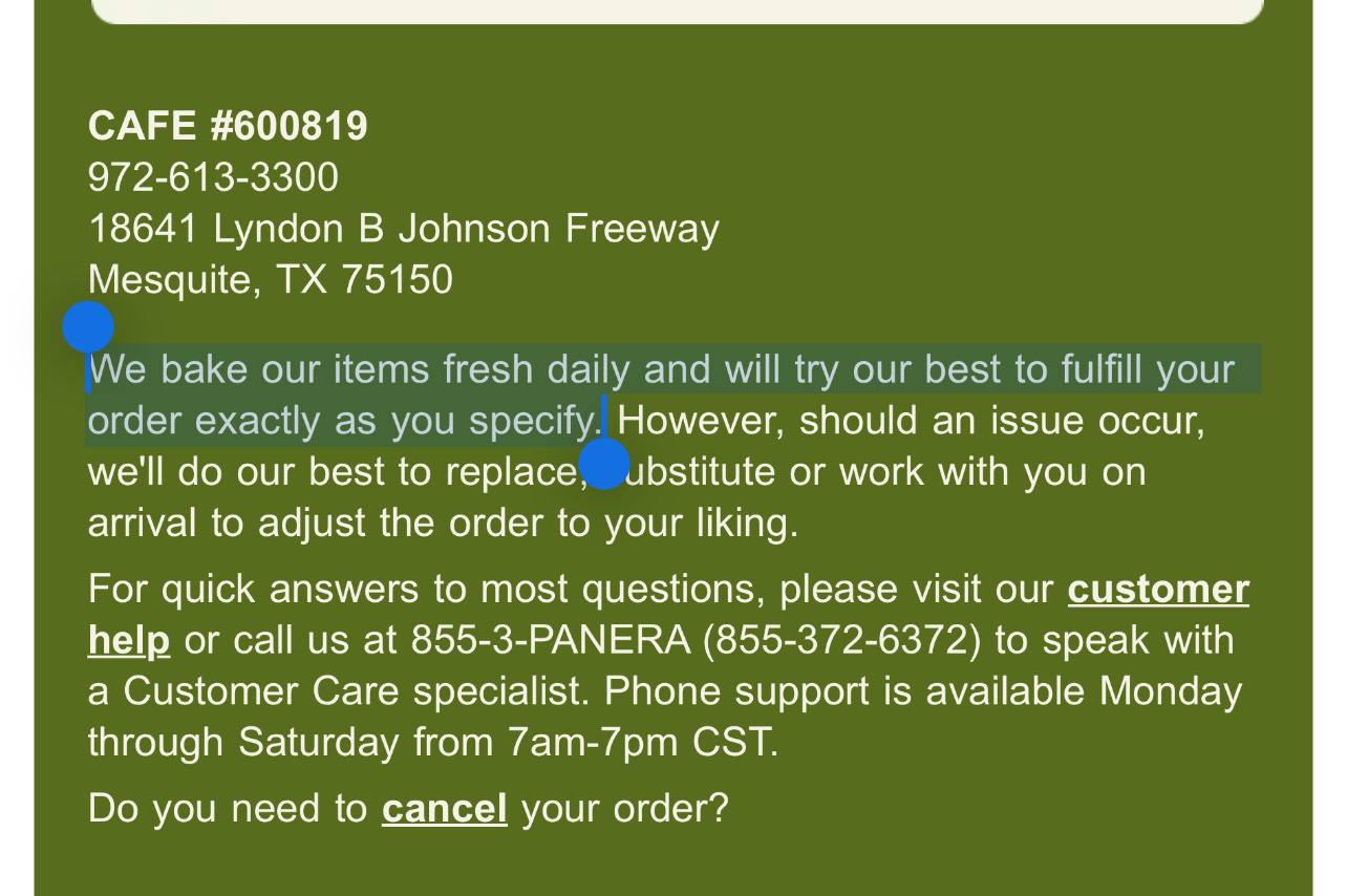 The customer service at this location is horrible, the staff were extremely unpleasant and rude. Even in the fine line description of my online order it states, “We bake our items fresh daily and will try our best to fulfill your order exactly as you specify.“ However, should an issue occur, we'll do our best to replace, substitute or work with you on arrival to adjust the order to your liking.