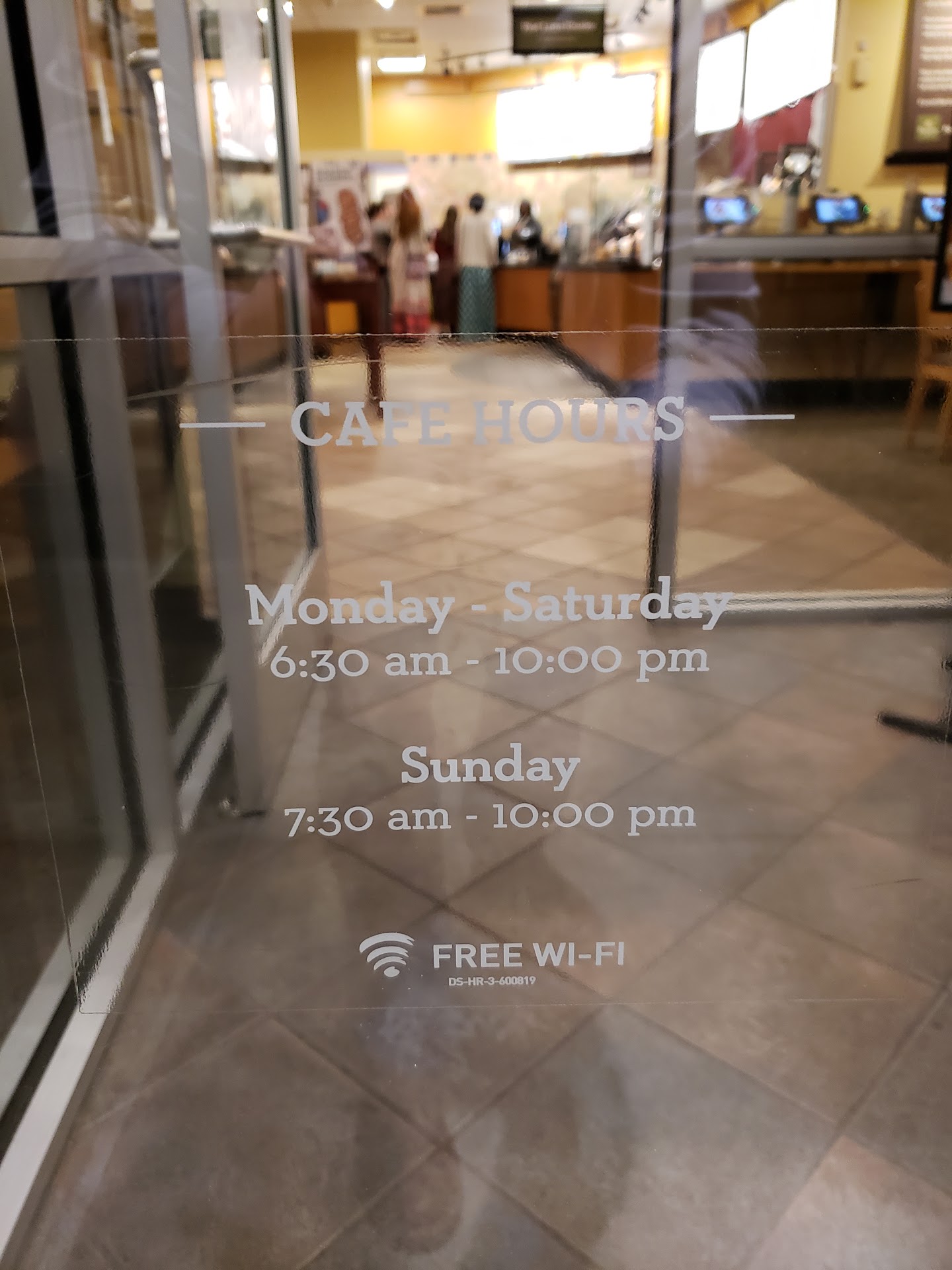 Read moreI got to this location at 8:00p.m. on Sunday night and went ahead and placed my order. After paying for my order I went to fill up my drink and a lady was already removing all the containers that dispense the juices and sodas. She offered to pour some of the leftovers (did not have another choice so I took something). Then I asked her, "what time do you close?" To which she responded, "we close at 9p.m." I showed her that online it said 9:30p.m. and on the front door 10p.m. to which she responded that "they just haven't changed it". I asked to speak to the manager to which she responded "her name is Mary and she is not available right now". A few minutes later after they brought out our food, Mary (manager) approached our table and asked if we needed to speak with her. I pointed out to the sign that said Sunday 7:30a.m.-10p.m. and she said that they have changed their hours about 3 months ago. I asked as to why the sign hasn't been changed since then to let customers know online and at the door. To which she responded that the district manager sent a sign that said 7:30a.m.-9:30p.m. (also wrong apparently). I asked Mary, "why don't you write a temporary sign to alert customers and provide good customer service"? She responded, "all regular customers already know". I asked as to how I could get in contact with corporate to make a complaint so she referred me to the website. While we were eating there we saw at least 20 people come in around 8:45p.m. and told that the cafe was closing at 9p.m. all of them seemed upset since the sign online and at the door did not reflect that. Overall the customer service was below satisfactory and left a sour taste in my mouth. Definitely, will not be coming back again to this...