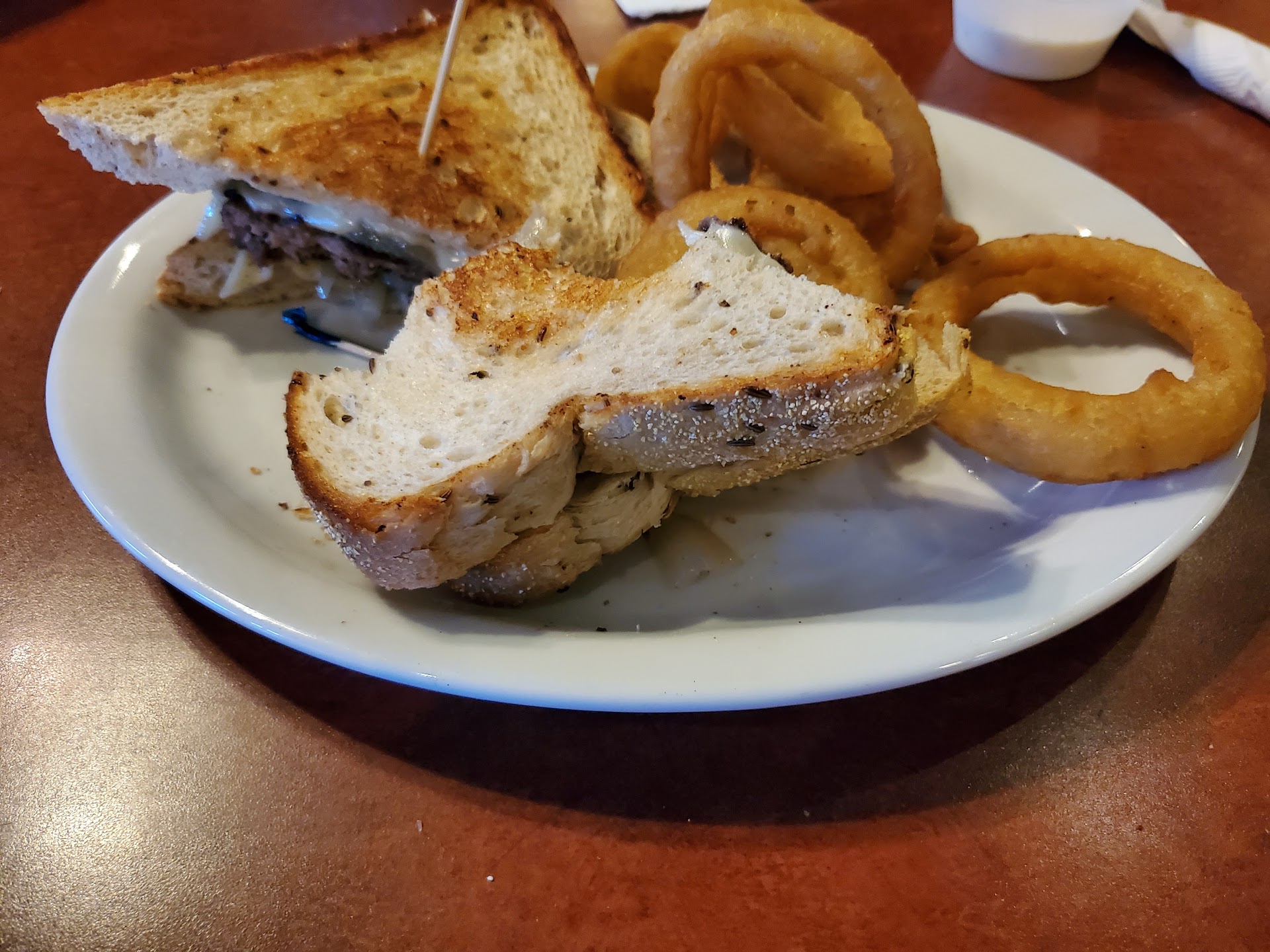 They have a bar side and a restaurant side of the establishment. We sat on the restaurant side. When our waitress FINALLY showed up to our table there was an EXTREME!!!! language barrier that made it very difficult to communicate. We asked for a drink menu but they don't have one, so we had to order whatever we could think of on our own on the fly. We understood that they were extremely busy, but it seemed to take WAY longer than it should have to receive our drink and food order. I had already drank 3/4 of my drink by the time the food got to our table and I had to order another. The drinks were good, but my burger was SUPER burnt!!! I had asked for it to be medium-well and it was well, well, well done, to the point that the first thing I tasted with every bite was the burnt meat and it left an ashy taste in my mouth. The fries were fantastic! My husband loved his burger, the bun was replaced with garlic bread and it was AMAZING!!! I'm not one to return food, because I don't want the staff to mess with my food while it's in the kitchen if they get upset.