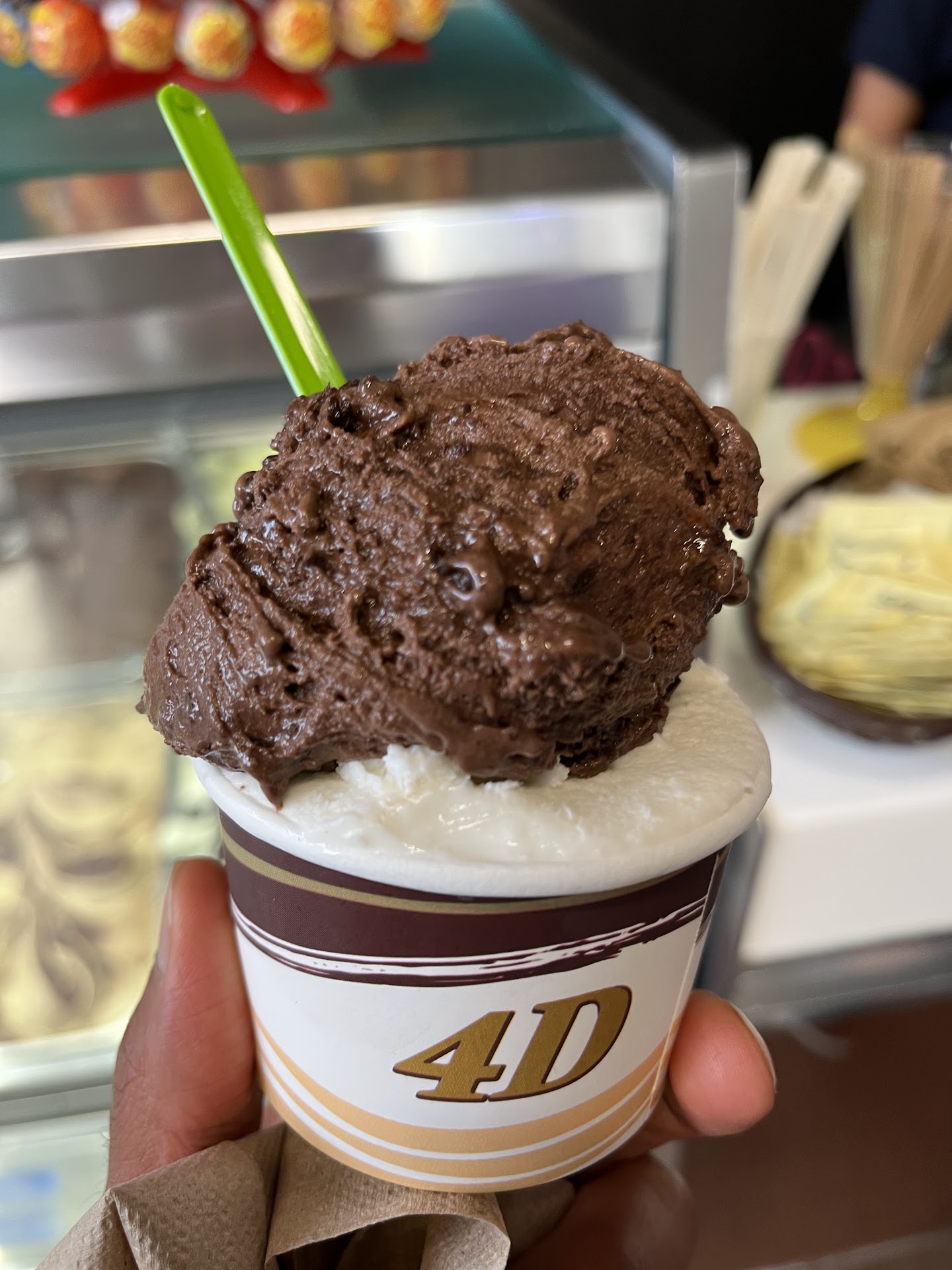 I wouldnât call it the best gelato as you would find in ROMA, FIRENZE,VENEZIA, MILANO, NAPOLI but the staff is extremely friendly- two women from Argentina and Venezuela. The gelato didnât have the same richness as ones in Italy and the flavors werenât as intense. We had coconut, pistachio, chocolate, strawberry. None were memorable except the price. We threw the pistachio away. Itâs a cute little boutique with a seating area that included copies of Peopleâs magazines. We left a nice PROPINA. Itâs a nice place but after eating at Joeâs, I wished we had just eaten desserts there. If the quality was upgraded it could match the quality of our homes here. Maybe itâs the AIR INCORPORATION. Maybe at 4D they whip in more air than in Italy. Yes all gelato and ice cream have air in them. Without some air the gelato would be like a popsicle. But when your gelato has less zip or less taste it is because of too much air added. Giolitti in Rome, Italy to me is the standard bearer of what gelato should taste like but maybe here my neighbors like 4D. I will go back and do a melt test because letâs face it in AUGUST there is nothing like a cup of gelato to reward us from our 5 mile walk a long South Pointe.