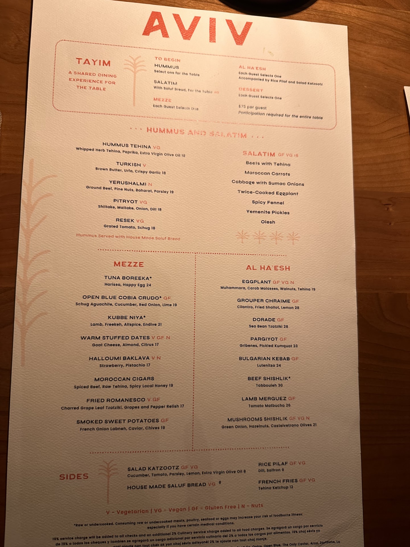 An amazing meal! With Zahav being our favorite restaurant, we had high hopes for Aviv. It did not disappoint!! Past the beautiful bar, into the even more beautiful spacious interior (with 2 levels), we were welcomed by the kind staff & seated. The cocktails were unique yet balanced perfectly and all were delicious!! We met Nicole, the manager who created these combinations, and she took the time to explain how she came up with some of them. She was a pleasure to speak with. Our waitress Daniella was very helpful with the menu, and suggested we try the Tayim (table sharing) menu so we could experience all of the food. So happy we took her advice! The food was all delicious! With an open kitchen, we watched fresh baked bread continuously pulled from the brick oven . Starting with the best hummus tehina, we made our way through all of the yummy salatim. Even if you think you don’t like beets, trust us, you will love these! Next came the mezze where our favorites were the Moroccan cigars & stuffed dates, onto the al ha’esh: eggplant & grouper were our favorites in that section. Last but, definitely a highlight of the meal was the coconut malabi. Chef later told us we could find the recipe on line. It was so incredible, we just might try to make it ourselves! What impressed us beyond just the delicious food, was the incredibly attentive service! Our water glasses were filled repeatedly, empty plates were cleared immediately & crumbs cleaned as soon as the last plate was removed so we could prepare for dessert. The staff was all so warm and friendly; we sat for 3 hours and enjoyed every minute!! Chef Michael Solomonov was there all night, moving from table to table to greet customers and take time to speak with everyone! We saw him giving a tour to a couple who wished to see the kitchen. When he arrived at our table, I mentioned that I own his cookbooks, but that I couldn’t cook anything from them because the recipes were too advanced. He said he had a new cookbook “Zahav Home” that was filled with simpler recipes and he disappeared to see if they had any in the back. He returned with a cookbook and signed it for me! We wish him much success in his new (& very large) restaurant. We made a reservation to return before...