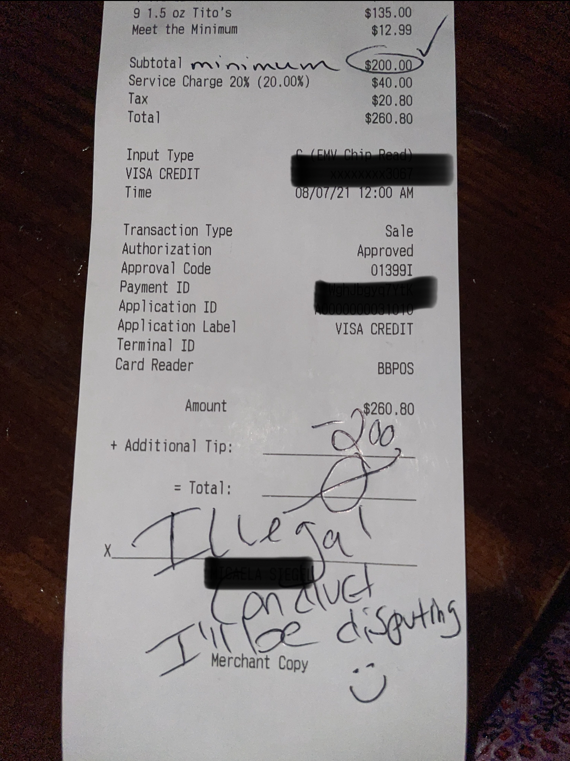 P.S.: Please see attached for the end of our receipt. As you will see, we were charged for “MEET THE MINIMUM.” This is truly abnormal.