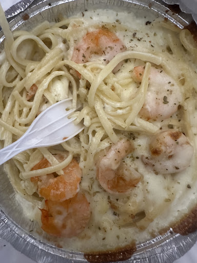 Terrible service , we waited over an hour for our order. The food was tasteless and the order was made incorrectly. The pasta was disgusting, the shrimp were dry, and the Alfredo sauce tasted like plain milk. The shrimp also smelled awful, like a piece of rubber. The garlic bread was completely hard and dry impossible to bite through. The wings were inedible.
