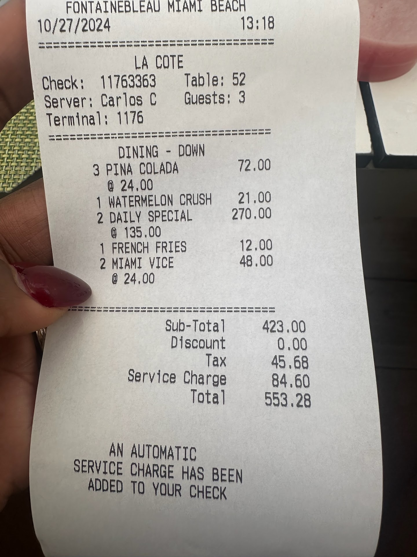 My sister's and I decided to have a quick lunch after we left the beach. We reviewed the menu and waited for the server to come to the table. My sister's were looking to get a burger which was 30 dollars and I was looking at the oysters which were about the same price. Once the server, Carlos arrived at the table he immediately recommended the special, kabobs consisting of beef, chicken and shrimp. My two sisters decided to go with the recommendations and order 3 separate orders. Carlos collected the menus, left and then came back to the table and asked are you sure you wanted 3 orders because it was a lot of food. We were confused because we never been to a restaurant where the server come back to the table to change your order. We went with his recommendations again. After a very delicious meal we received our bill of five hundred and fifty dollars! Our mouths hit the floor at the expensive lunch of kabobs. A special is generally offered at a discounted rate and a tool to increase customer satisfaction. As the consumer im not satisfied with the poor communication of the "special" price. I wouldn't spend this much at a steak restaurant!! Carol's came back to the table to change our order not because of the large amount of food but I strongy believe because our bill would have been well over 700 dollars. We do appreciate that however transparency would have said, oh by the way its also an elevated price and then I could inquire about the price instead of it being a surprise. I'm truly disgusted at this server for not voicing the price because it was inflated from the menu prices and it wasn't posted anywhere in addition to a 85 dollar service charge!! My sister's are out raged that a casual lunch turned into an...