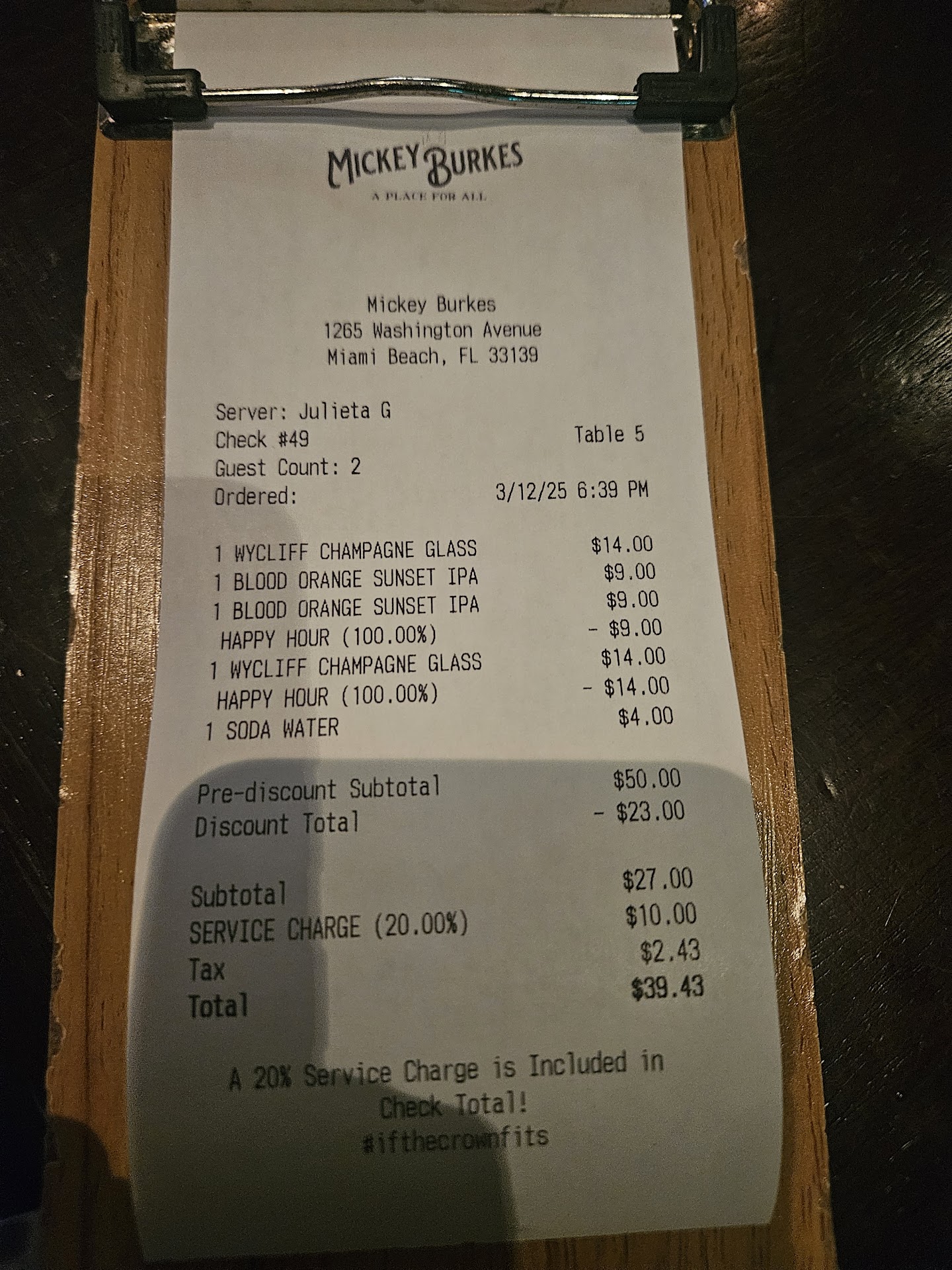 I like Mickey Burkes. It is a cozy and warm place with plenty of screens to watch sports. So why 3 stars, you ask. Long gone the days when a tip was the measure of how satisfied you were with the service. I have watched the tips at restaurants go from voluntary amounts to 15%, 18%, and now 20% auto tip added to yout check. And if you are not careful, you get tricked into tipping on top of the 20% tip when your credit card merchant copy comes back to your table for you to sign with a line saying tip! Ok, here is something new to add to my tipping experience over the years. The 20% auto tip is calculated on the pre discounted happy hour amount! Ok, i always left extra if i got a discount to make up for the difference, but i want to do that, not you. And then the good old put tax after the tip trick. You dont pay tax on tip, and i dont want to pay for your income tax either! I just hate to be...