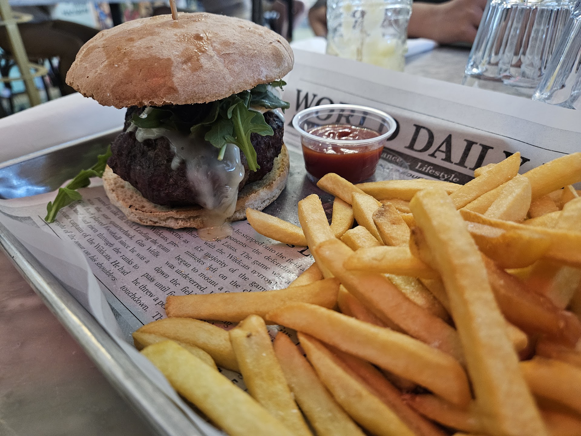Our entrees included the Grande Bellisimo Burger, the Crispy Spicy Calabrian Sandwich, and the Grilled Chicken Florentina. The burger, made with a massive, handmade patty, was seasoned well but it was cooked to well done despite our request for medium. However, the Calabrian chicken sandwich was excellent, with a pleasant hint of spice and sublime bread along with the chicken adequately seasoned, making it my favorite dish. The Grilled Chicken Florentina was disappointing; the spinach was slimy, and the overall flavor was lacking, resulting in us discarding half of the sandwich.