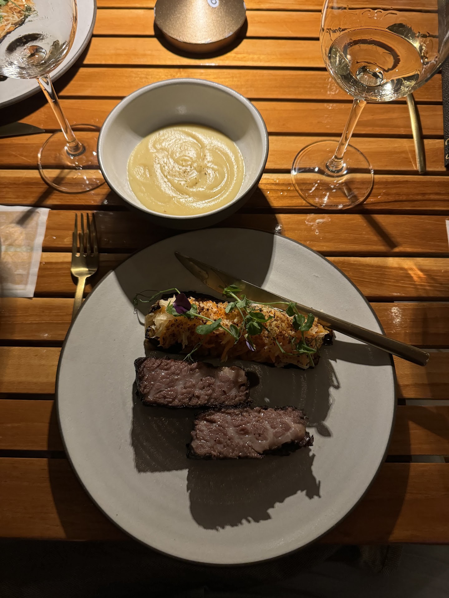 Sweet Greens Salad Binchotan Diver Scallop Kinda Toro Unicorn Peanut Gazpacho Foie Gras Terrine Wagyu Carpaccio East Side King Fried Chicken Katsu Sando- Kurobuta Pork Milanesa Smoked Heritage Chicken Pork Adobo Rice Short Rib Rice 3lb Côte de Boeuf: Wagyu beef bone-in rib-eye Japanese Sweet Potato Purée Cheddar Cheese Ice Cream Sandwich Crispy Fried Leche Flan Cashew Tart