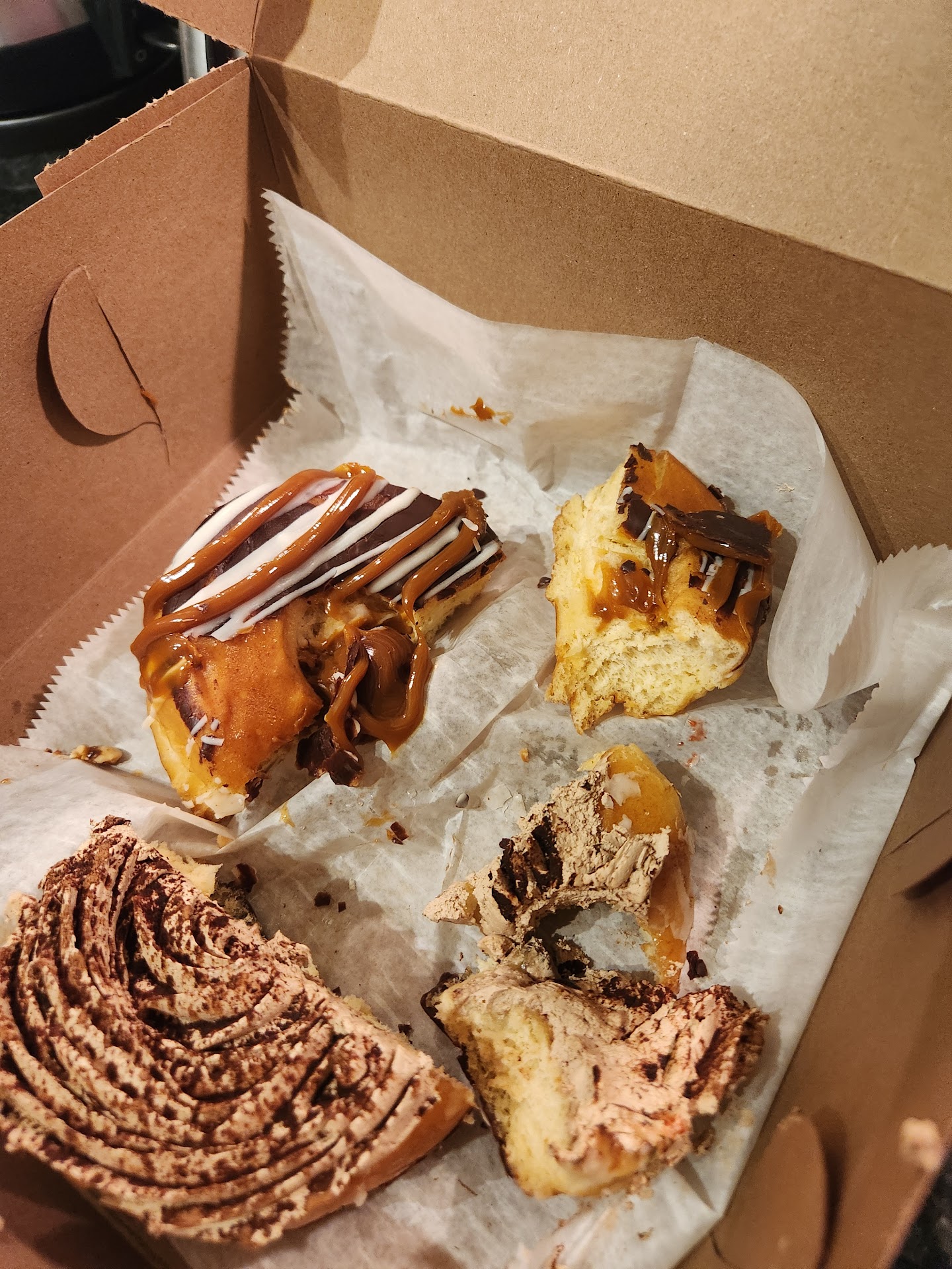 Wanting a savory item to eat with all the sugar that was in the donut box, I bought a pane de bono. I was really taken aback when a $2.00 item’s suggested tip came up at $2.50-2.80. It first came off as a suggested total to me, then I realized I would have been paying a 110-130% tip. I suggest paying attention to the payment screen if you’re using a card to pay.
