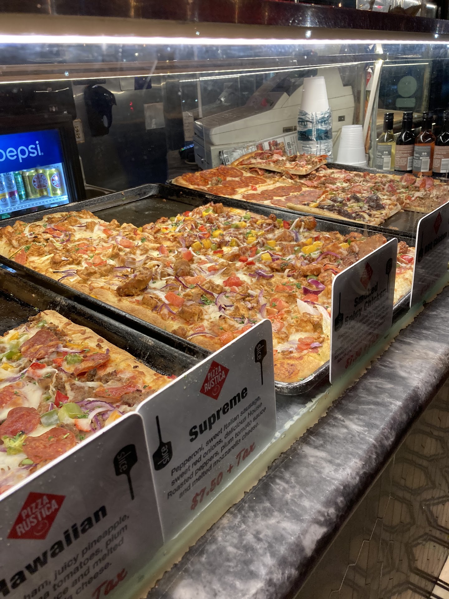 Read moreNever ever again. Pizza should not cost $8.00 for 2 slices exp with rude staff and long lines. I went after a club. First place I saw was this place There was 2 females working the counter not rushing taking their sweet time. I waited on the long line and regretted spending a dime there. It was so slow which gave me more than enough time to read the menu. Finally. I asked for 2 slices expecting it to be triangles for $3.50 nope. She grabs a square slice. I said thats not what i want and she said that's the pizza I ask that's how they come ? For 20 years sarcastically, um ok. She said $4.00 for each slice I said I want the $3.50 slice. She replied there is none I said why not? The latin girl looks at the African American girl and they both laugh now I'm furious said but it says $3.50 that's what I want she said this is what I have. Then I say fine being upset I still order 2 and she starts to ask a guy that skipped what's he want and another what they want holding 2 slices on a silver spatula. I lose it why are you serving them and not putting mine in the oven? She ignores me and takes the next order after that still holding the slices. I should have walked out but regrettably let this person get on my nerves I respond your rude and a few expletives finally she puts it in the oven bam it's hot as hell on a plate I start putting toppings and expressing my content and she pulls out a box stuffing the 2 slices in them did I say to go? No, more rude behavior. The pizza was terrible I speak with a manager next day to find out its $3.50 plus tax an apology no mention of my change only probably .50 for the 2 slices but they kept it. Did they offer anything to make up for the experience? No, I'll tell them to explain it's $3.50 plus tax, great too bad I feel robbed cheated mistreated and disgusted by the nasty pizza and rude service so the solution is to warn customers. RUN. Don't subject yourself to bad service and bad quality food because it's late night hours you work hard like me and deserve better Rustica your...