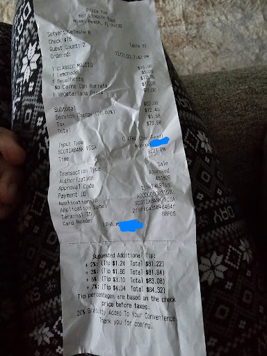 Greeting time: 10. (1 minute) (wrong server though) Drink refills: 2 We all got water and had to ask multiple times for our water to be refilled. Checked in after food came: 5. Checked in when we were halfway through our meal. Hostess: 8. She was very friendly and gave the restaurant a good first impression. She pulled our tables together quickly and sat us immediately. A server greeted us quickly and then she reprimanded him and told him to wipe off our table and that the table belonged to another sever. Management. (Stephan?) 3 I observed this manager being very friendly to guests and at first. He was staying on top of the servers and making sure everyone was taken care of, but after asking him multiple times where our food was after waiting an hour, and being told that he “would really hook us up with something extra to make this worth our time” I soon realized that wasn’t true. I asked him if we could at least have our salad (three times) while waiting for the pizza. He said yes and proceeded to walk to other tables and talk for 15-20 min. This manager is very friendly and has the potential to be amazing, but is very dishonest to his guests. We received our bill which had the full amounts, no discount and a 20% gratuity added to the check. Leif took the bill inside and they gave him a 20% discount. It left a very bad impression after waiting so long to receive a full bill with gratuity added Atmosphere: 8 A few indoor tables and mostly outdoor seating under tents. This restaurant is in a beautiful setting in Miami Design District surrounded by shops and restaurants. Table comfort. 5. Chairs and table were average Reservations. Yes Food overall: 5 Bread- 4 The bread was burned and not warm Appetizer: —- 4 Caesar salad (we received this with the pizza after asking several times if we could have it first) It was an ordinary salad with dressing on the side. It lacked dressing but our server didn’t come back for us to ask for more. We were worried it would take too long to receive any anyway so we didn’t bother asking Main course 6. Pepperoni pizza The pizza was very greasy and the dough was just ok. I was expecting a much better Italian Pizza and the other honest reviews are spot on with their descriptions of the crust and flavor. Dessert 9 Tiramisu. This was delicious and tasted as it should. Drink: —— Speed of food. 0 Speed of drinks 2 Healthy options 2 Presentation of food. 5 Cleanliness 5 Tables clean but smell from kitchen was like a dead body Cost $$$ Out of five. Overpriced for the quality of food. They also add 20% gratuity to the bill Portions. 7 Military discount. We didn’t ask because we had to wait so long for everything this...