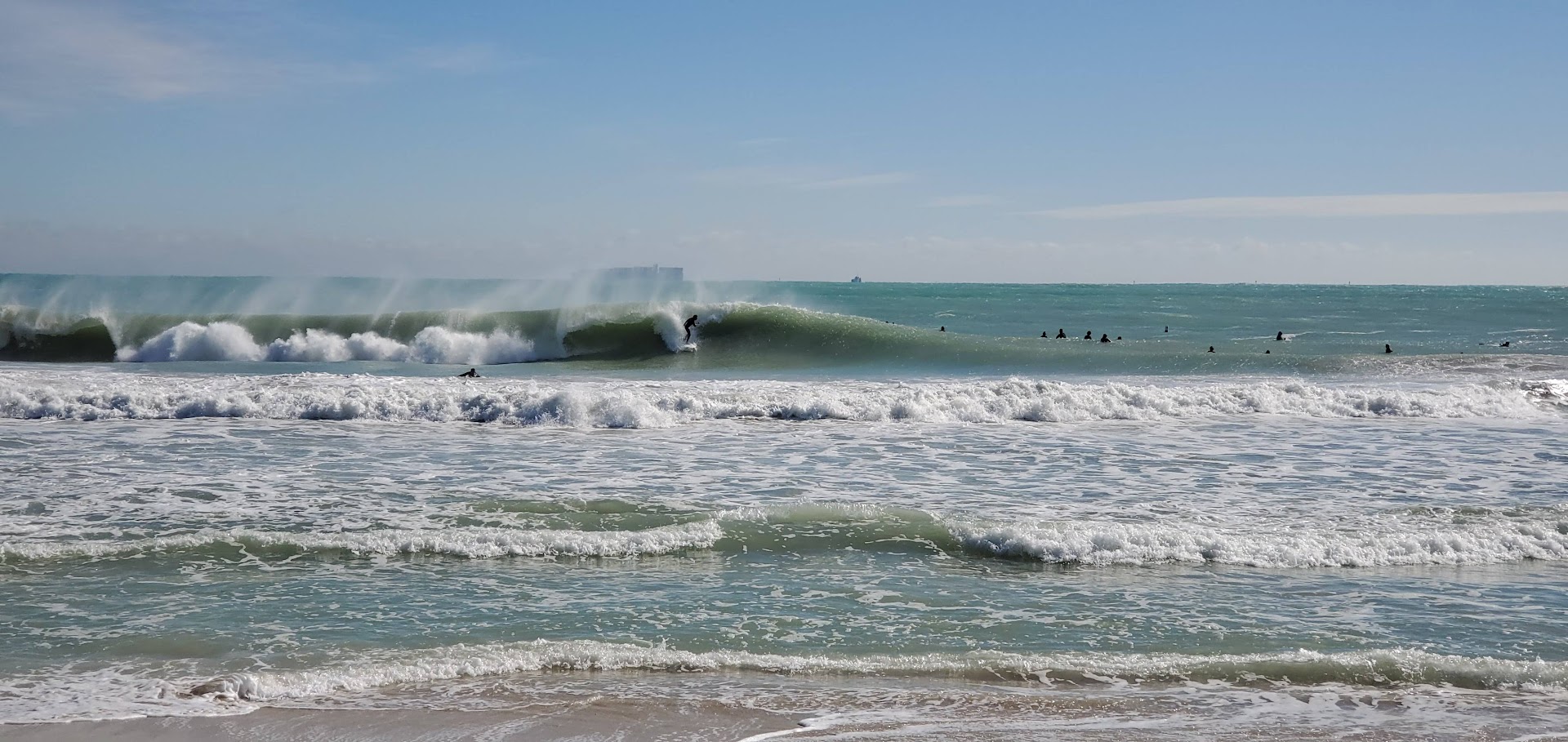 .Check pictures. Triple overhead swell that was about head high+ at all other areas. Deerfield would be the closest to see a big difference. The reason for this phenomenon is the inlet is a deep Chanel that runs out about a mile plus with 2nd reef on either side. Swells bend towards the beach out much farther than anywhere so they don't lose the amount of energy like regular beach breaks. So you get a larger swell the breaks in this 1/4 miles strip of beach. It is really quite remarkable! I will post more...