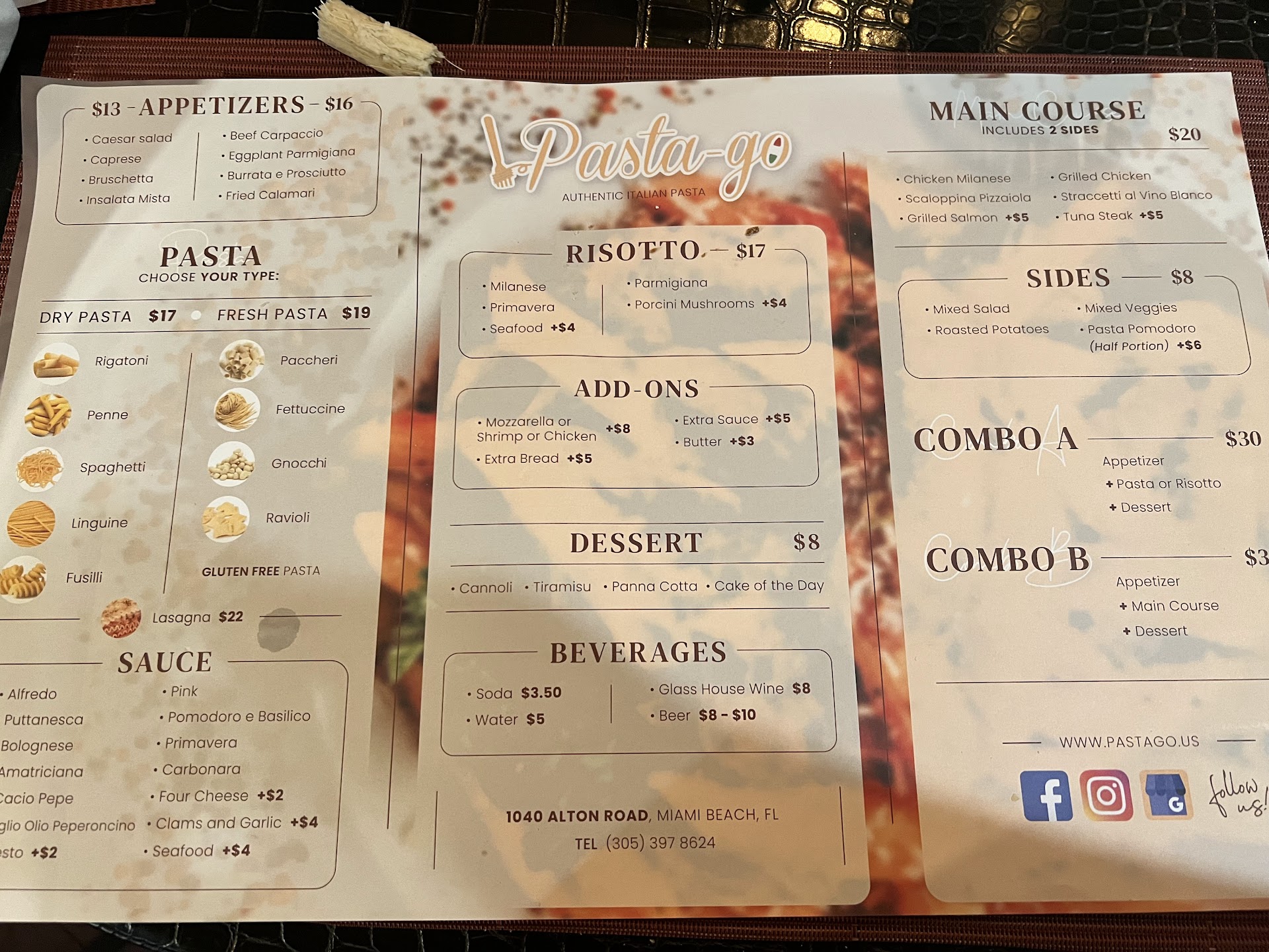 Read moreGave this place a shot tonight. After already being up to $37.00 for a salad and plate.of alfredo, I didn't bother to ask for.a wine list. The delivery driver was Amazing, though his tip was never asked.about at purchase. They're clearly too busy overpricing generic, boxed fettuccine, than worrying about the whole.team it takes to make.a successful business. I was so far less than impressed with my meal. When We discussed a mixed green salad, I thought it was a given to get the tomatoes, cukes,onions n such that would come in any salad my Mamma made. Prolly woulda been another $10 upgrade anyway. Given that I just painfully paid $10 at the grocer for a bag of mixed greens, I'm kinda disgusted to know they'll triple that and not even dice a tomato into it. Worst part of this whole experience, is looking back at the slap to the driver about the gratuity. I called back and tagged on $10 for the driver. This was after I slammed the lid on the dumpster. So far, the most over priced and undervalued experience I've had in SOBE. Of which, I've had far too many. $5 for a plain slice, COLD!!!!! $20 for a simple salad, $10 for a smoothie.... I know it's been tough folks but instead of trying to recoup all your losses on the next available wallet, try recouping by kicking it up a notch! All these wallets have been here and through it...
