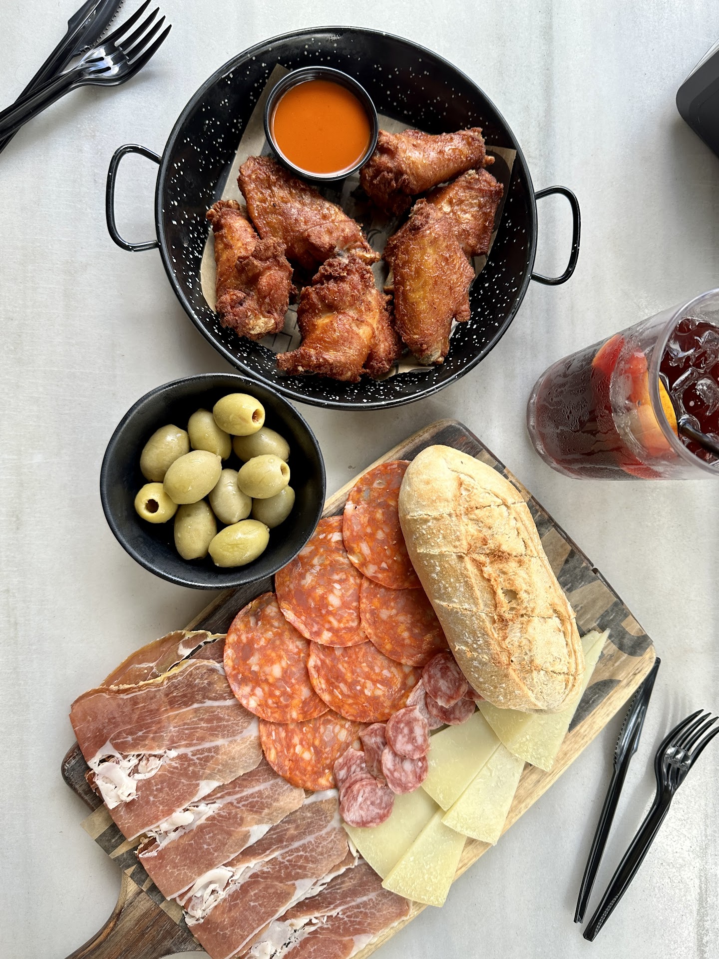 The wait time was minimal. Everything was fresh. The Sangria is served when the order is placed. The flavor had the right balance of taste and body, very enjoyable. The bread warm and delicate. La tabla was delicious and the olives 🫒 were on point! Chicken wings is not what I would typically pair with a meal like this but I’m a wing guy and wanted to try.