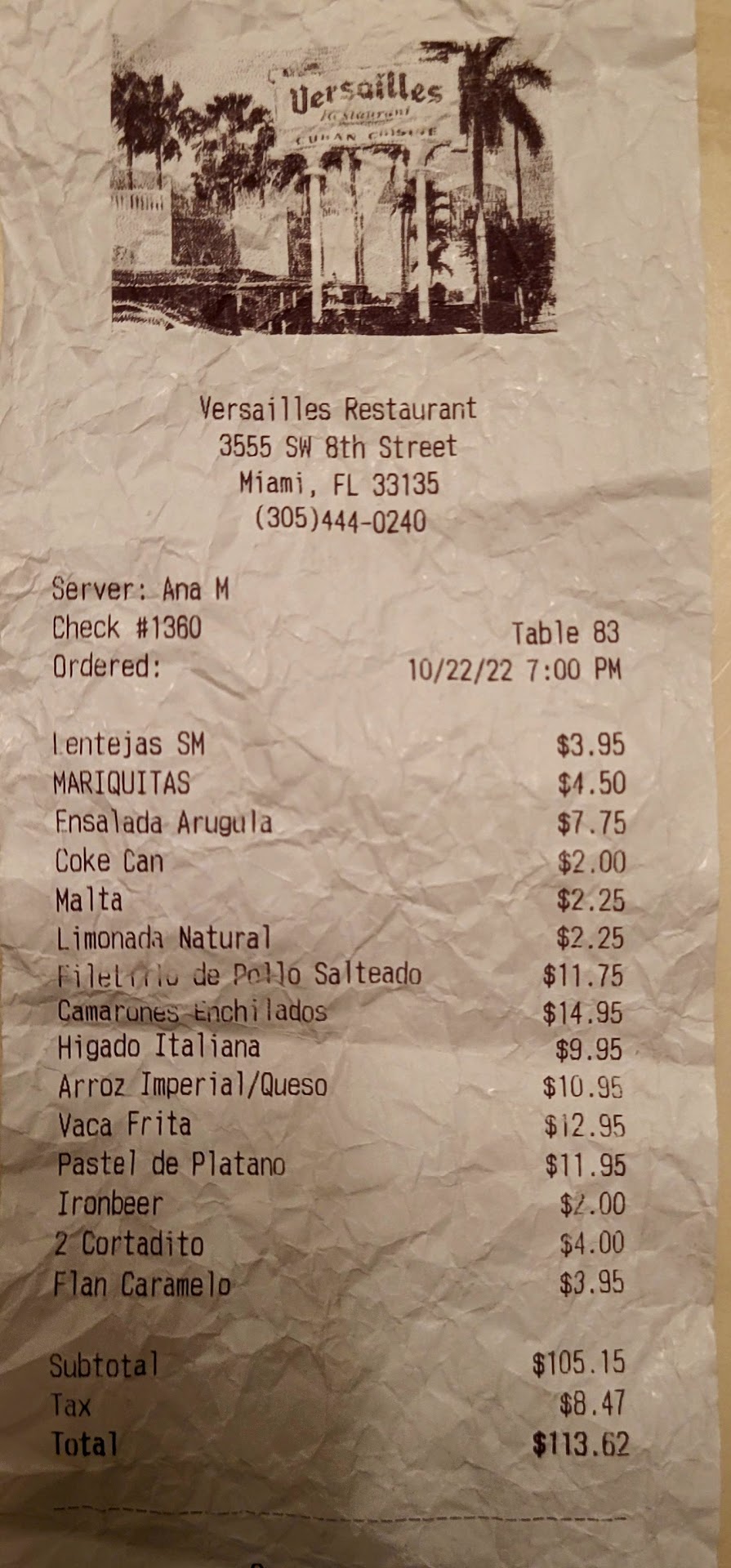 Read moreWhy one star review? Keep reading....Good Latin food and service. Very clean too! I ate here today with two other guests, THREE IN TOTAL! We had a serving of mariquitas a churrasco steak, camarones enchilados and Salmon. One cafe con leche a cortadito and a coke. EGHTY NINE FREAKING DOLLARS!!! WHen looking at the receipt I noticed they charged for one of the two sides of each plate. The server never warned us of the additional charges and that a smaller churrasco was available at a lower price, she just took our order and asked us which of the two sides we preferred. We thought we were getting the special that was posted on a black board but she pointed out that it didn't say "special " it says today's servings. Very deceptive!! I've been coming here for years and have recommended this place countless times but to pay $24.95 for a churrasco and extra for the sides is excessive. NO VALUE HERE at these prices. Sorry, but you won't be seeing me anymore. UPDATE: 10-22-22 It is obvious that your response is automated and indicative of an establishment that doesn't care about customer experience. Attached is a receipt of a SIX person dining experience at one of the most ironic restaurants in Miami the Versailles. $113 for a party of six for great food and service. I'm not in anyway trying to trash your restaurant, you have a good thing going but as a business owner myself I know how you can easily loose your customers by not being focused...