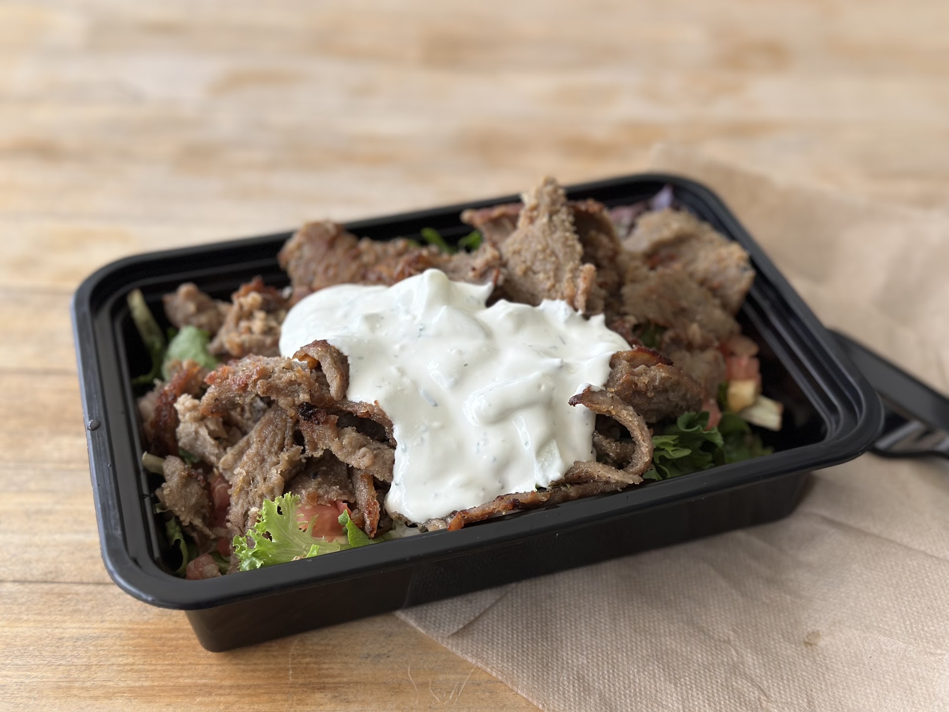 The food , the gyro plate was only a styrofoam container of gyro meat, some pita bread, and a half filled container of tazikki sauce. For $25 bucks, I thought I would get a side salad and a drink included.