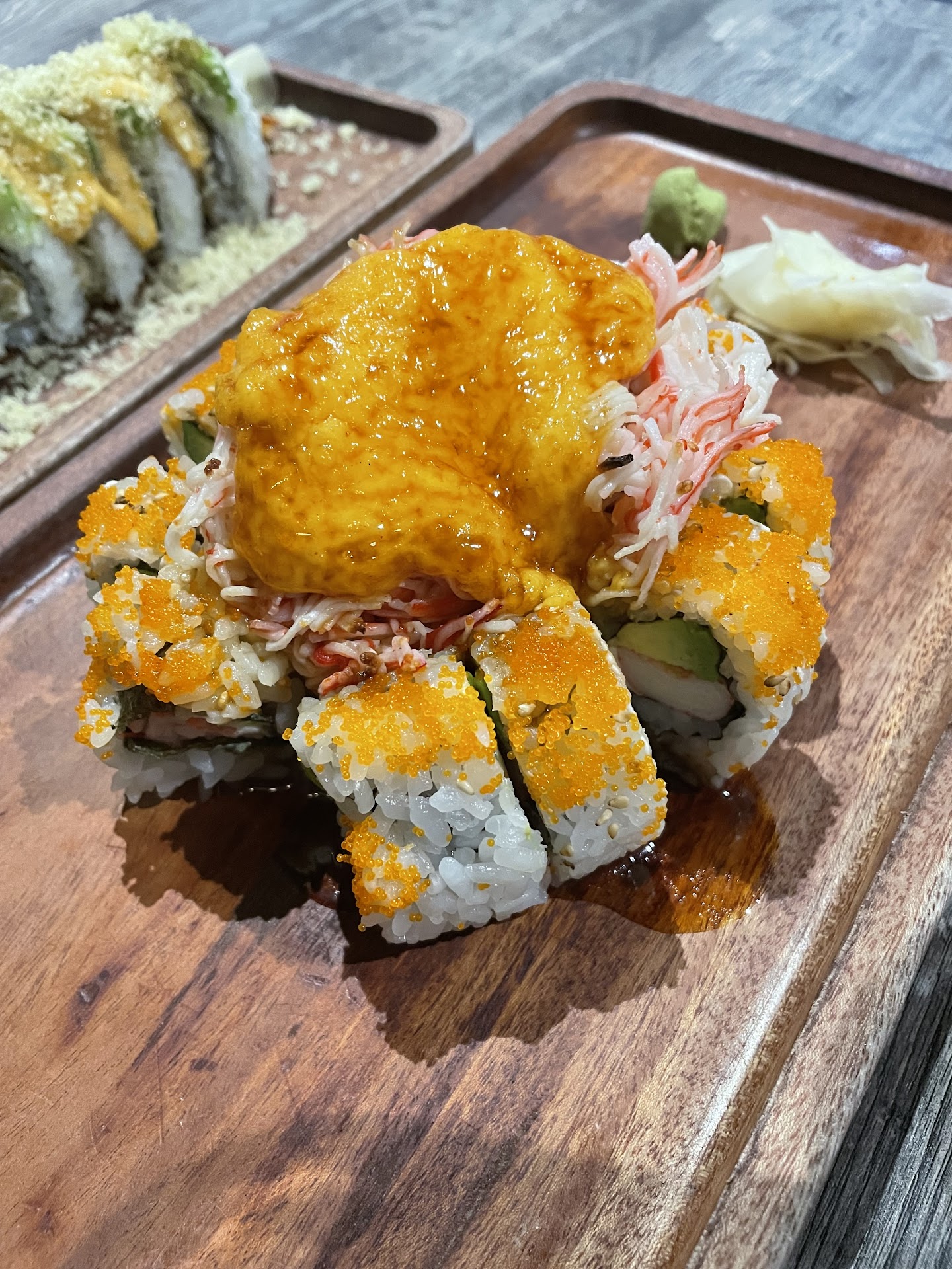I ordered an island roll and asked for no avocado. The roll was ok although the rice was VERY dense and the roll was huge in circumference and had to be bitten in half to eat. At that point the roll falls apart. He placed his water glass on the edge of the table for a refill, our server passed by at least 6 times and never bothered to refill it - she did tell one of the other servers that she wanted to go practice her twirls! I had to get up and get the pitcher myself.