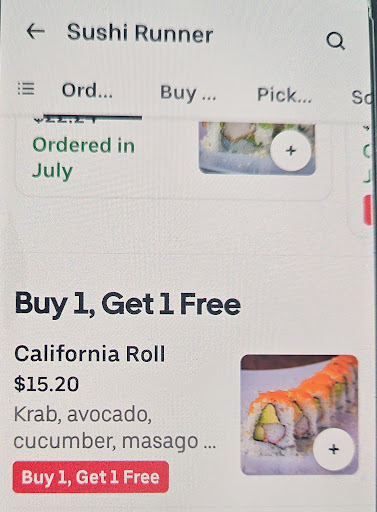 Read moreCustomers be aware!!!! if ordering from sushi runner. They have a scam set up on food ordering platforms. My experience happened on Uber eats plat form. Buy 1 get one free is only to purchase once. If you order more buy one get one free all other orders are regular price. This information is not disclosed on apps.They accepted our order then called us to tell us of issue in their exact words. The staff actually told us that they know that once accepted uber, uber won't cancel order. They also said they won't cancel and too bad if we don't like it. Watch what you order from them on any delivery platform. We actually only ever ordered sushi from there since location opened but never eating there again. As a person who tries to give google reviews when deserved this business definitely deserves this one. I recommend try someone else.--------- Im replying now 8/19/2025 to your reply sushi runner. You are wrong about that it is in uber eats plat form. I actually went in and just added 6 to my cart and its only charging me for three. You are very much aware of this. Iam adding a picture showing my proof. And no where on uber dates plat form does it say one time purchase. Its literally says at the bottom you are getting...