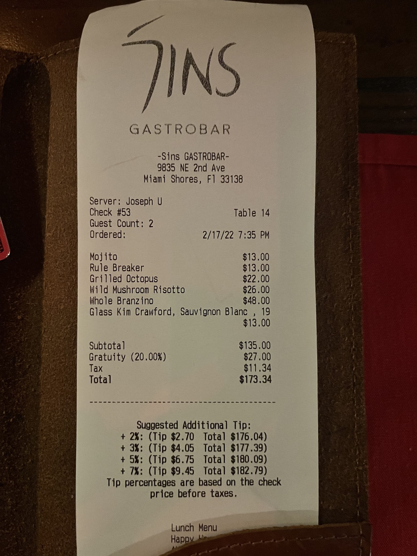 I will end by saying that I am a Miami Shores resident of over 20 years, I dreamed of the day that we would have restaurants, bars to go to, but having Sins Gastrobar surpasses any dream I could have ever had for a neighborhood bar. I know none of this could happen without the amazing Chef Adriana that just creates a menu that changes constantly so that we are always excited to come out for dinner, and have a new experience every time. Her brother Carlos, the visionary of the creations that we get to enjoy in this beautiful place. Our beautiful, fun and friendly Marianna, thru her service she makes our dining experience flawless. Last but not least our very own Sofia, who just put so much detail and enthusiasm to make sure that I had a great bday celebration. We were 10 of us, from vegetarians to carnivorous. From winoâs to cocktail drinkers. We all left there like we had just been to the most Magical event and place ever, and I am so lucky to call it home, my neighborhood favorite place away from home. Thank you Sins Gastrobar for making my bday brunch unforgettable, but most of all to know that with every visit to your place, I canât count on a great experience, itâs one great...