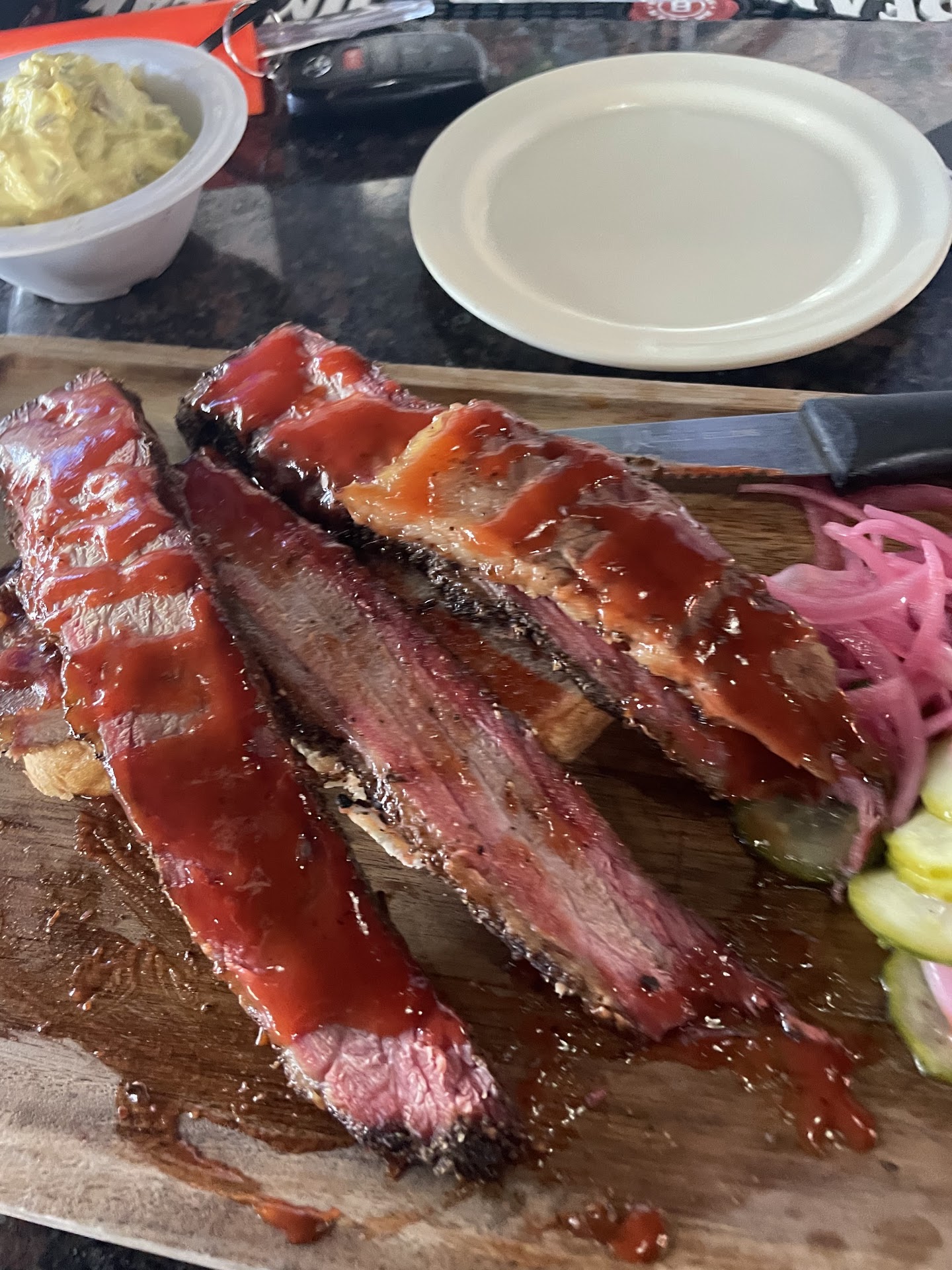 Being from Oklahoma and with distant family members celebrating 80 years in the BBQ business in Shawnee, OK-I know brisket. What I received on a slice of bread, sliced 1/4” thick brisket hidden in a slurry of sauce to hide the drying shadow of lunchtime freshness, BUT with a beautiful bark and a modest hint of damage-possibly from a microwave. The meat was dry and needed a knife to cut. From reading reviews, I know Woody’s knows his brisket and how to cook it. My recommendation is NOT TO SELL IT if you can’t reheat with steam. Anyone NOT knowing brisket and the BBQ business certainly wouldn’t return for this $35 plate that I left uneaten. On that note, I was somewhat surprised I wasn’t questioned as to why I didn’t eat it. The bartender was super friendly and attentive for the most part but missed a plate of brisket as she scraped it clean. The Southern style Potato Salad was super good and even the baked beans had a nice finish. I hope you see my comments for what they are, my opinion. If I am wrong about the reheat, my bad. However, as good as your reviews of the brisket are, leaving it on the counter overnight or over a weekend OR a microwave reheat is the only things I’ve ever seen ruin a great brisket as I am sure this was at lunch. My review is not personal or intended to be taken in a bad way. When they sell left-over brisket in Oklahoma. it’s always sold as “left-overs-order at your own risk or be here at lunch or dinner-time” (I’ve seen it done successfully); ESPECIALLY at 3:45 in the afternoon. You met my expectations when you could have blown me away. The place has a cool vibe, it’s super clean, as mentioned earlier-the bartender is a joy, and the prices are spot-on for the cost of today’s food supplies, labor, taxes, utilities, wood, rent, insurance, workers comp, advertising, and licensing.