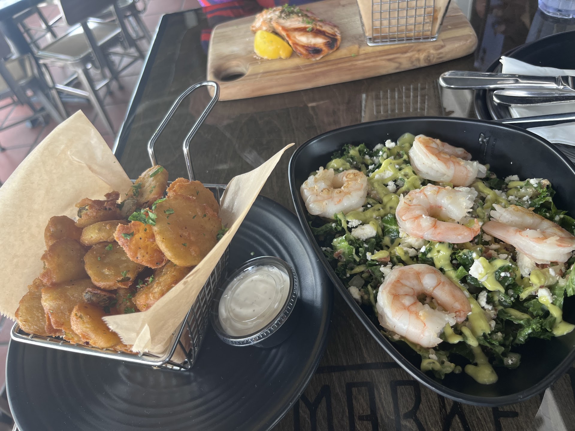 My friend got then salmon which was supposed to be covered in garlic butter but it was just a plain piece of salmon that was tasteless so I asked for extra garlic butter and he brought out a chunk of it and tried to hand it to me in the midst of me eating instead of placing it on the table. I assumed the butter would come melted, I evidently assumed wrong. After all was said and done my food was okay. The truffle fries are good, salmon is a no-go, fried pickles were overbreaded. I then ask for 2 to go containers, he brings the containers and I asked for a bag. He tells me there are “No more bags for today” as I’m walking out struggling with items because my hands are now full, I see a man loading his food into a bag provided by the restaurant.