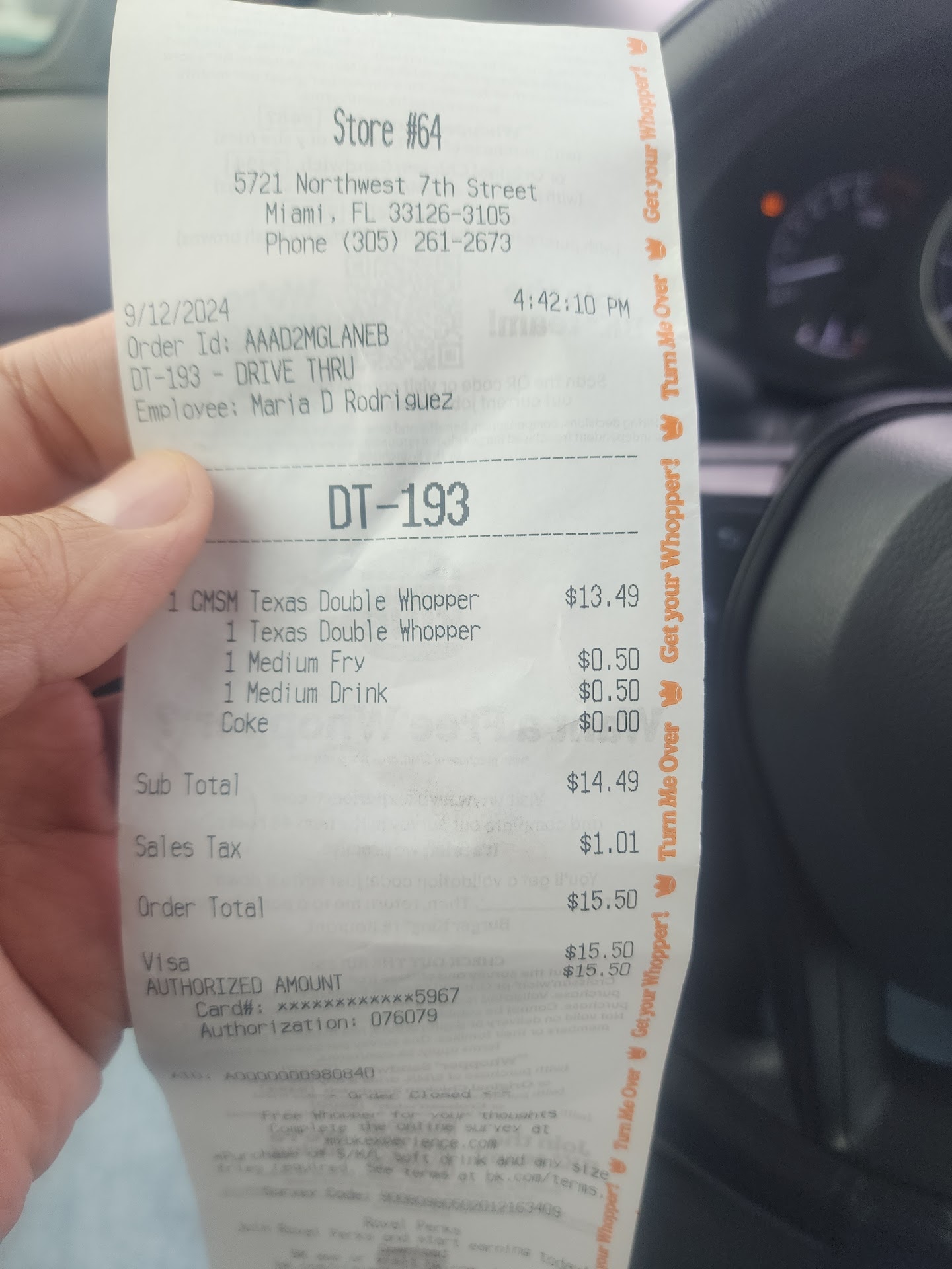I ordered two whoppers and two chicken sandwiches. Your screen states that buy one whopper, get the other one for a dollar. One chicken sandwich for the same prices. The ring me up for each sandwich. When I saw the price, I was charged double, instead of getting one for one dollar. When I told management, she sent me back to associate. The female associate told me I had to specify that I was buying one and get one for a dollar. I need explain myself better. Like if I need explain that I am buying two sandwiches. You would think I am getting the the deal. So I ask if they were going to fix it, they didn't bother to try. Plus it took me over 30 minutes to get thru the drive thru. This is the second time I had a problem in this Burger King King store. Never will i shop him again, plus I am going to write a bad review online. The worst ever! The worst customer service ever! They are the slowest burrker king ever. The management worst ever. A 5 year old has more class than the management working there. Trust me, don't ever go to this burger...