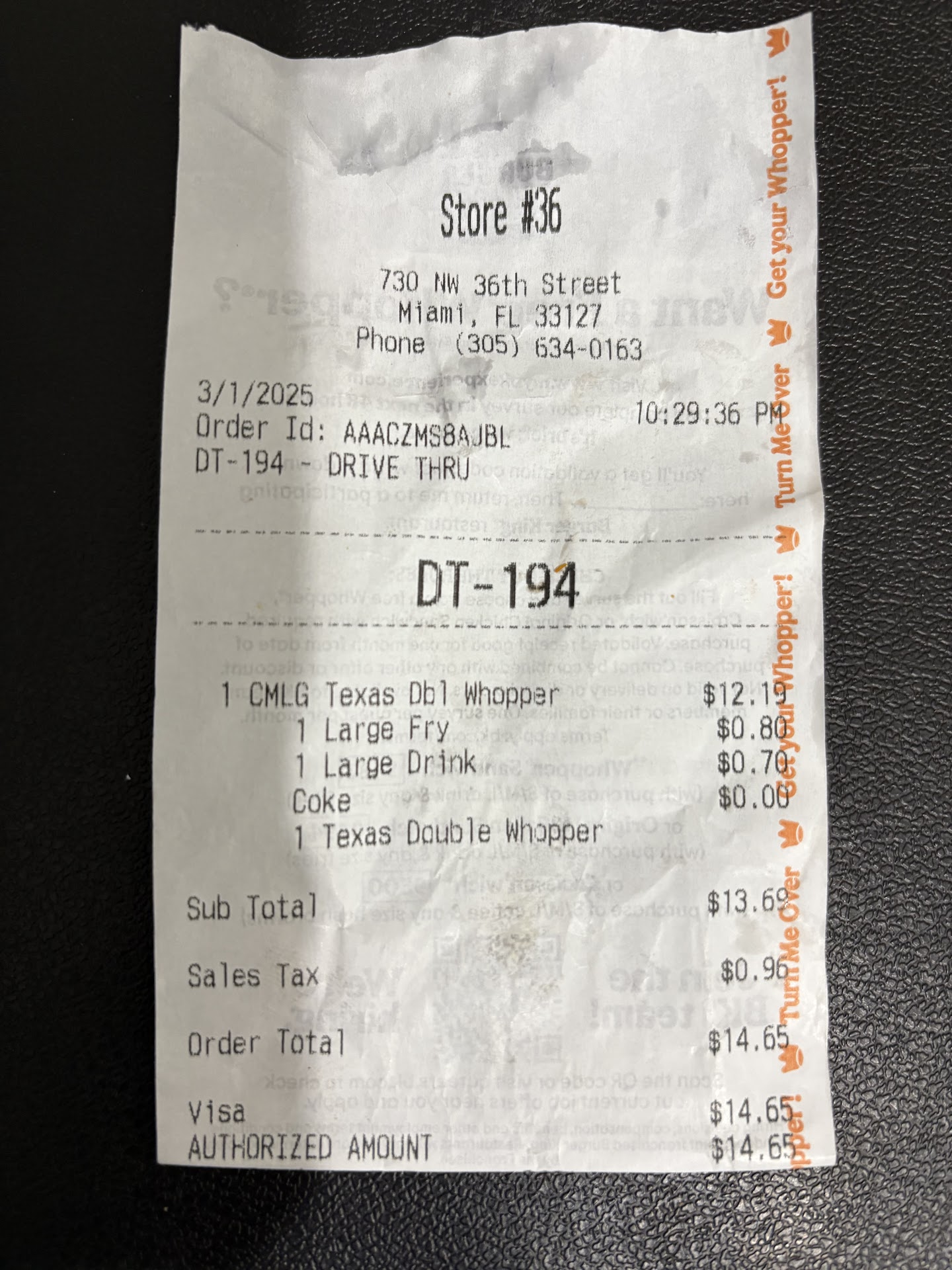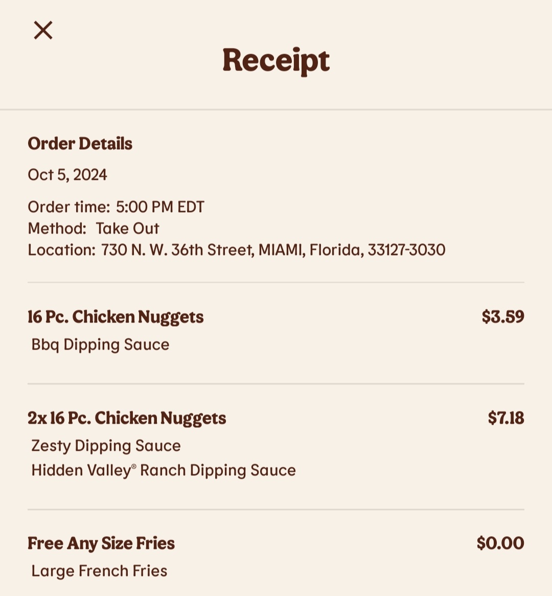 Read moreI order often from this location because it's the closest one to my house. I mostly use the app to place an order for pick up. If my children didn't like the chicken nuggets from BK I'd probably never ever go back to that particular location. There's this black lady who I think is now a Manager who has a very BAD ATTITUDE. I think she's a Manager because she was wearing a different shirt that from the regular staff. On October's 5 around 5pm I went to pick up my mobile order. I emptied out the contents from the bag and I was missing items. I ordered 3 16 PC nuggets and instead received 3 8 PC nuggets. The cashier was trying to solve my issue when the very rude black lady jumped in and told her not to give me anything because I wasn't missing anything. I had to explain that they can check the receipt to see that I was missing items. She told me that I needed to calm down. I was very calm and polite. She's the one that always seem confrontational. Burger King will just hire anyone I guess. It's a fast food restaurant after all. I tried calling Coorporate several times and no answer. I will start cooking homemade chicken nuggets more often instead. This location doesn't deserve my hard earned money. The Hispanic ladies that work there on the other hand seem nice. Overall, I'm completely unsatisfied with the service received at this location. I'm attaching my receipt for that day in case anyone higher up would care to...