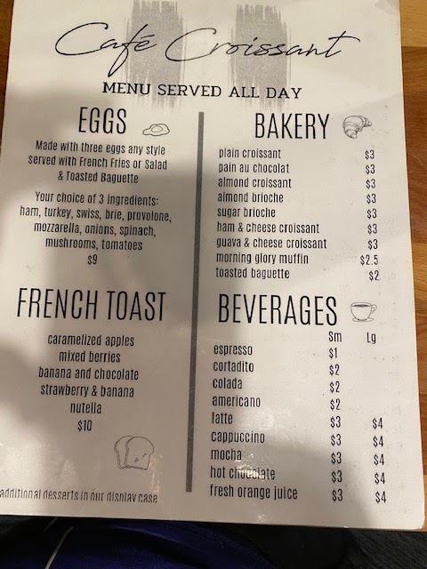 Cute Café Croissant 2021 is bigger than the sign out front, a gem capable of shining. Kidnap a kid off the street as the waitresses seem to be friendly in a good way with children. The overall service is friendly and quick, a 4 out of 5. This is a neighborhood hangout located just off 17th St off Coral Way. Parking may be limited and hard to find on weekdays. There’s a TV toward the back of the restaurant with soccer or sports games. The French décor allows you to escape the Miami vice, be it 30 or 40 minutes. And just because you have been in Gay Paree, don’t give this place a one-star rating. Breakfast comes with three eggs, and my over-easy eggs came out 1/3 suitable with two overcooked, but the taste with the ham and cheese overcame my notice. The tomatoes and lettuce were fresh, and the bread was crisp. Although looking flat on the plate, the three-egg omelet was loaded with spinach and suitable to the palate. The cappuccino was favorable and worth the price that came with complimentary chilled cold water that tasted filtered. The prices are right for eggs, French toast, baked goods, crepes, or sandwiches. For those in the habit of handing our credit card to waiters when asking for the bill, this is not the place. The bill came with an 18 percent gratuity added to the total. The charge slip came back suggesting 18, 20, or 25% tip above the total bill that added the gratuity and tax with the meal. If you paid no mind, you could wind up paying a 41% tip. I ended up leaving a 22% tip. I respect waiters who advise clients when the tip has been calculated in the bill and come back to check on you during your meal. We are at the tail end of a pandemic recovery where many small places have lost their businesses, and people are in need. Give small establishments a try. Leave a good tip if you can. I will try this place again, possibly for a crepe and sandwich and a take-home croissant. I hope this gem gets its polish. Viva la...