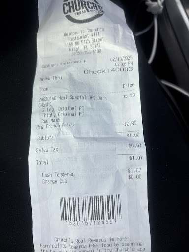 I've always had a great experience here but the cashier Michelle I guess Church's training consist of being nice nasty to its customers. I been to the location in Opa Locka & the location on 79& 22 ave. For the 3 for 3$ deal & I've received it just like I wanted it whether it was all legs all thighs or 2 thighs & a leg or 2 legs & a thigh. This nice nasty cashier told me I couldn't get it that way so I had to order a 2pc mix with a side & drink that I didn't even want. Michelle the nice nasty cashier offered no condiments for my order. Gave me a biscuit that had to have been there from the moment they opened because it was hard as a rock then when I asked for honey mustard for my friends chicken bites meal she purchased I was told I had to pay for honey mustard. Whhaaatt??? Michelle the nice nasty cashier who trained you??? The order had 2 chicken bite dinners you offered no sauce at all try listening to the customer don't just hear what's being asked but listen first before you try to be nice nasty with a unfriendly demeanor that your service today was beyond trash... Church's needs to review this CASHIER'S TRAINING immediately. I always come here she's the worst cashier I've encountered... 💩💩💩💩💩💩💩💩💩💩💩💩💩I love this location but today's service from Michelle the nice nasty cashier HER NASTY DEMEANOR MADE THE 💩LIST & I COULD ONLY GIVE 2 STARS...