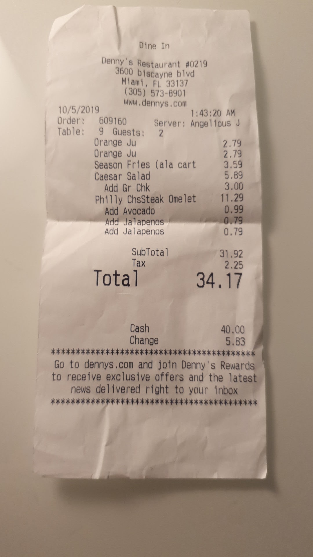 Read moreDenny's, a familiar chain known for its expansive menu and affordable prices, has a location on Biscayne Boulevard in Miami. Despite its convenience to South Beach, my experiences there have been consistently underwhelming. In the past two years, I've visited this particular Denny's approximately five times, each visit marked by subpar service and a lack of cleanliness.