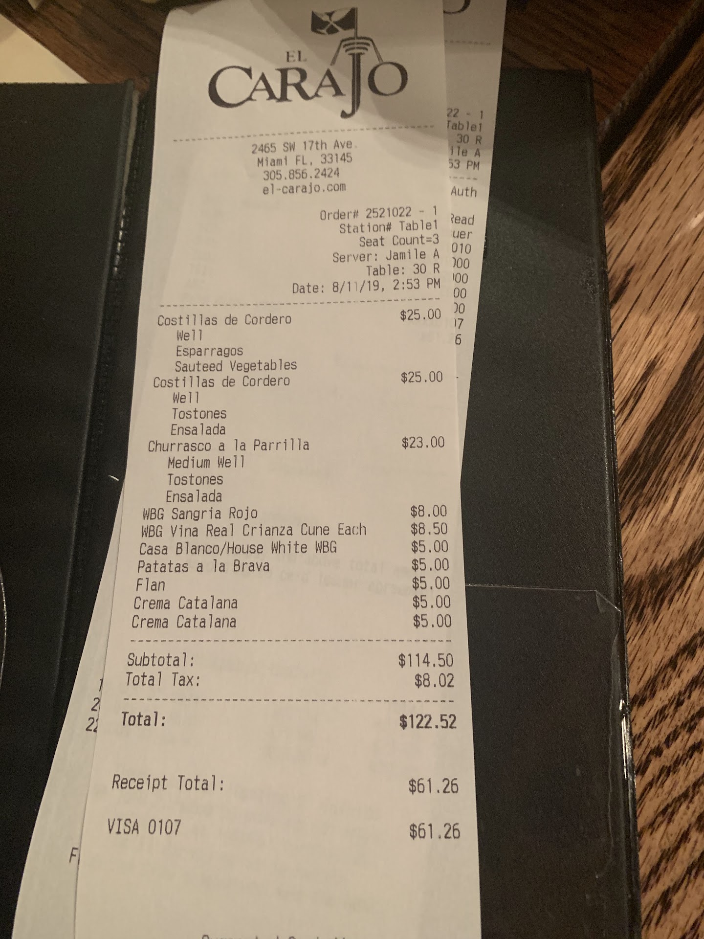 Read moreI visited this place a few years ago.Very disapointed then.I order Shrimp Scampi but they were as tiny as salad Shrimp.Never returned again and that was more than ten years ago. This time some close friends invited me to celebrate my Birthday.I honestly told them what happened to me ten years ago.They reasure me they have improved the food and I believe them ( they pay). We order as an appetizer croquettes enough for three people hoping they will serve us at least ten .We requested to be assorted flavors like Ham,Cheese,Chorizo,etc.We were told had to be all the same flavor.Unbelievable !.We agreed and we were served a tiny plate with only three units.Shame Shame Shame...The menu does not disclose how many croquettes come with the order,but the price is very clear,almost six dollars !! We ordered two Parrillas; one mix with seafood and the other meats only.Took almost one hour to be ready.The place was full of customers and we understood the delay.The orders had to be returned twice to the kitchen because the meats we requested them to be medium rare.They came well done.When we got the orders back from the kitchen the meats were correct but the rest of the food was stone cold.Shame,Shame,Shame. We had to ask for water.The service was mediocre at the best.We requested two glasses of house wine;which we got but they never ask us if we wanted more.My other friend does not drink.The check was close to $ 150.00 dollars ( I believe).This place does not deserve a rating over one star and the waiters need more training or maybe new staff.I was going to tell my friends not to leave any tip but honestly the kitchen staff are the ones to blame.Staff and waiters gather at the cashier to chat ,laughing very loud and talking of personal situations.Very...