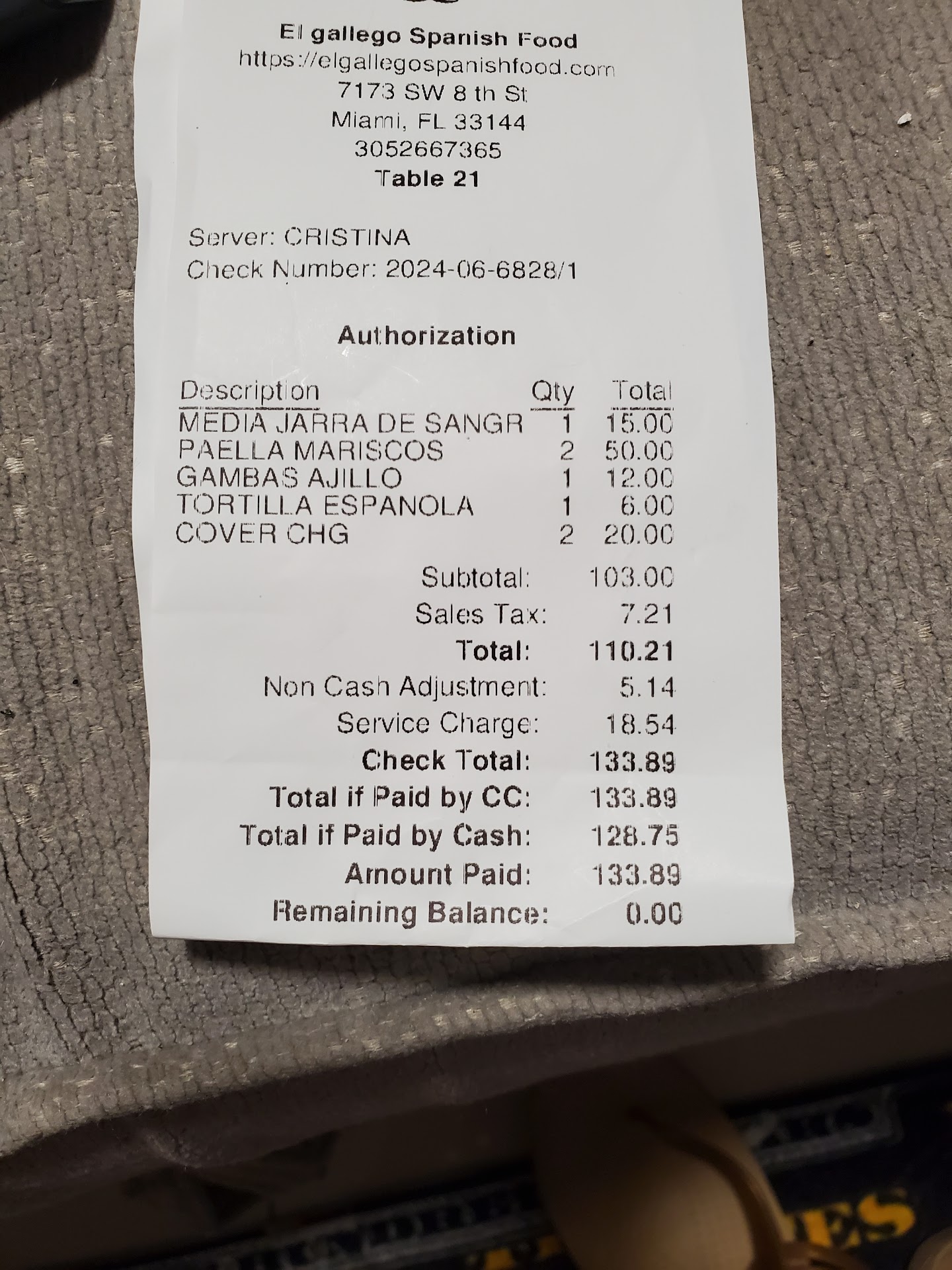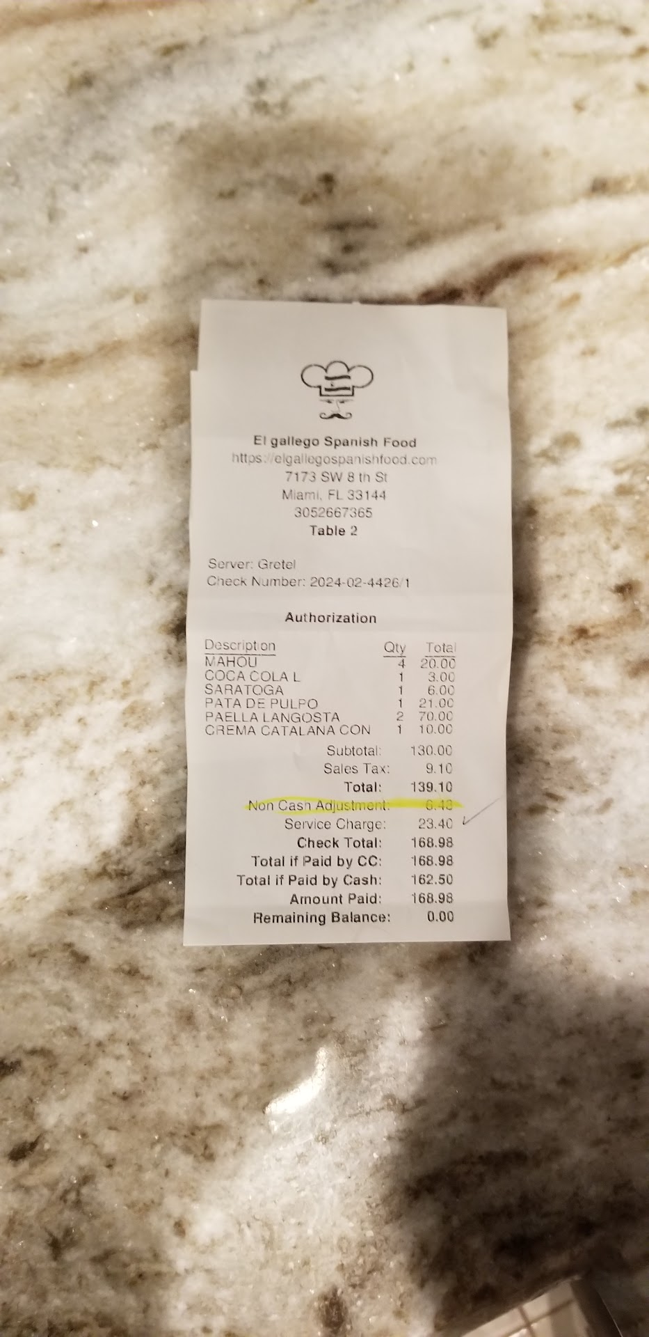 Additionally, this restaurant incentivizes you to pay your bill in cash. If you don't have cash, you are able to use your personal credit card but they will charge you a "Non Cash Adjustment" fee on your bill. This merchant is charging patrons for their Credit Card Processing Fees Upfront🤬 These fees are considered internal costs for running a business and it's based purely on the volume of transactions as a flat rate. Since the calculation on the receipt is based on a percentage of the bill, that translates to Profiting on every Credit Card Charge which I find to be very unfair & scrupulous business practices. Especially when this restaurant is charging Market Price for Lobster Paella.