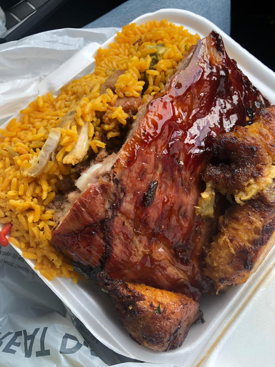 Yellow Rice (This was Actually Chicken and Rice, It was so Delicious) ⭐⭐⭐⭐⭐ Sweet Plantains (Fried to Perfection & had Good Texture) ⭐⭐⭐⭐⭐ BBQ Ribs (The Ribs were Soft & Tender, Well Seasoned & had a pretty Good BBQ Sauce on Top)⭐⭐⭐⭐ Rice & Black Beans (This had Peices of Pork Mixed into for a Great Surprise, It was pretty Good) ⭐⭐⭐⭐ Shredded Pork (Well Seasoned, The Trick here to Not get a Dry Serving is to have them Serve you a Little from the Top & Then Hefty Servings from the Bottom of the Pan, This was So Delicious) ⭐⭐⭐⭐⭐ Cassava (Yuca) (The was Soft, Garlicky & Oniony. Just Wish they Served Melted Butter with it to put it Over the Top) ⭐⭐⭐⭐⭐ Pork Skin (Got this Just to Crush it up & Mix it into the Rice, Can't go Wrong with Crunchy Pig Skin) ⭐⭐⭐⭐ Chicharron (This was Delicious, Salted, Porky & Crunchy... I would Love to get one of these Fresh out of the Fryer) ⭐⭐⭐⭐⭐