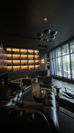 El Vecino, located in Miami's Worldcenter at 698 NE 1st Ave, is an exceptional addition to Miami's luxury hospitality scene. This sophisticated cigar and cocktail lounge masterfully bridges traditional cigar culture with contemporary elegance. The space immediately impresses with its modern speakeasy aesthetic, featuring dark wood paneling, moody lighting, and luxurious tufted leather banquettes that create an atmosphere of refined comfort.