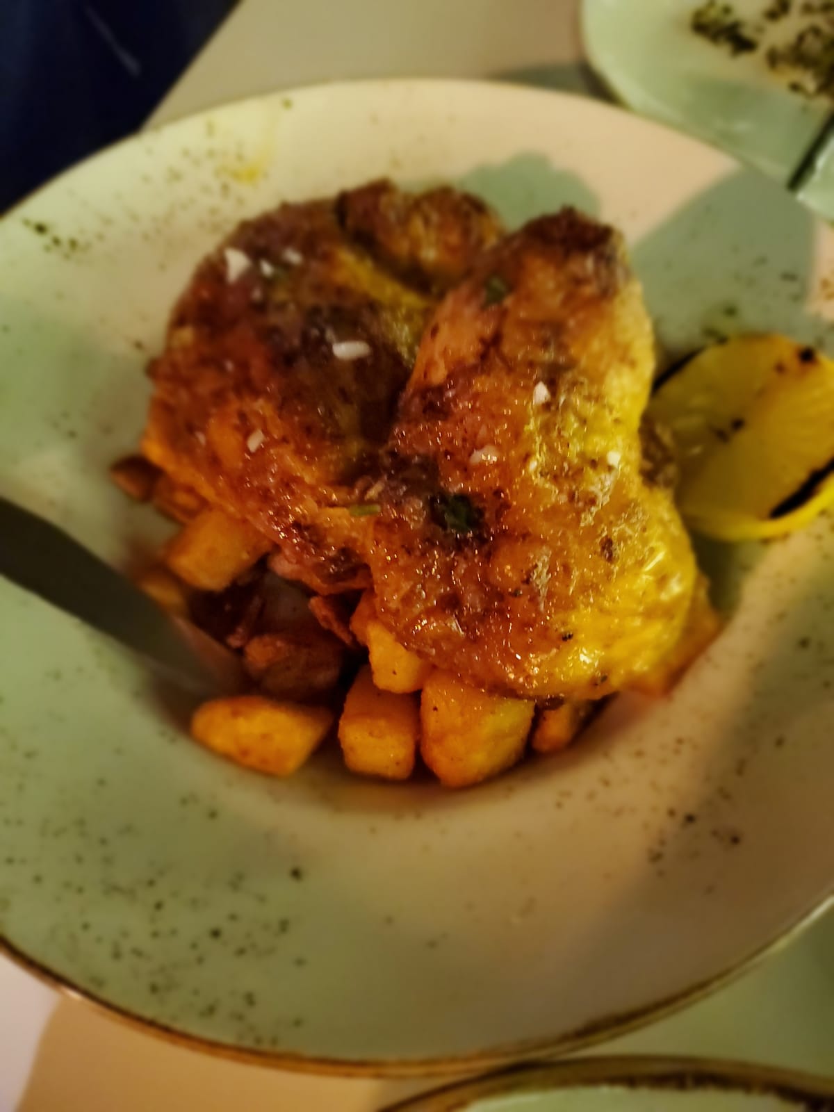I ordered the Brick Roasted Half Chicken, which was on the small side but plenty for lunch. It was seasoned with rosemary, and the skin was thin and crispy. Delicious, juicy, and tender! It came with delicious roasted finger potatoes. An herbed yogurt sauce accompanied the meal. I was very happy with Maura's recommendation.