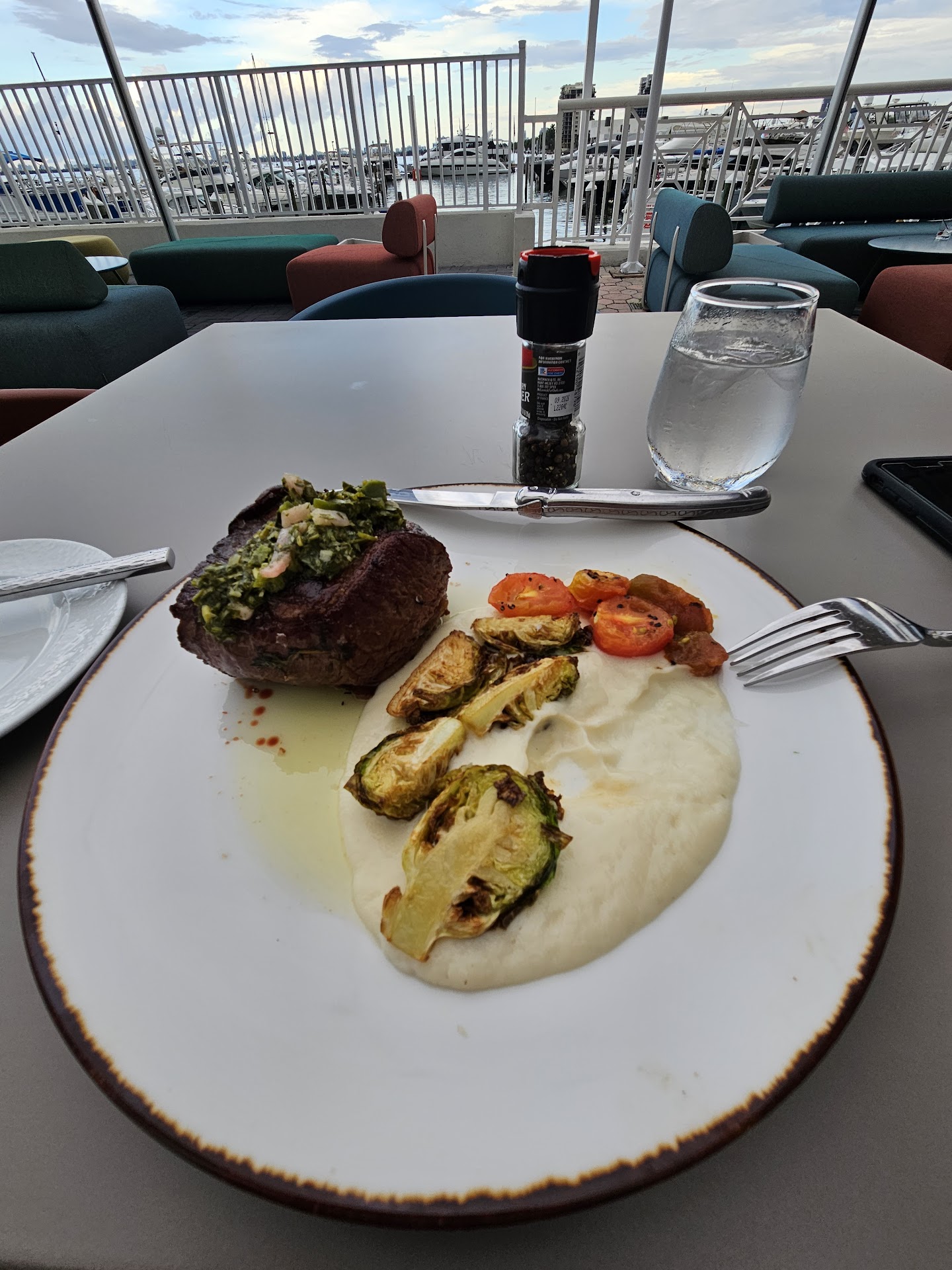 Read moreI stayed at the hotel and grabbed dinner tonight to use the 30 dollar "credit" you get with your 30 dollar a day resort fee. I sat outside by the marina. Nice seating area, weather was great. I ordered the picanha steak rare. The brussel sprouts were great but that's about it. The steak was the worst cut of meat I have ever experienced in my life. It was so tough I almost threw it off my plate trying to cut it. Each piece I managed to get into my mouth required chewing like my life depended on it to not choke to death. I had no idea beef could be that tough. I told the waiter who said he would tell his manager but nobody ever came out. I ate less than half, spent 60 bucks after tip and then went to the lounge to eat the free buffet. Save your money and go eat somewhere else. One pic is of the steak and the others are what I ate from the lounge. The seafood risotto in the lounge was...