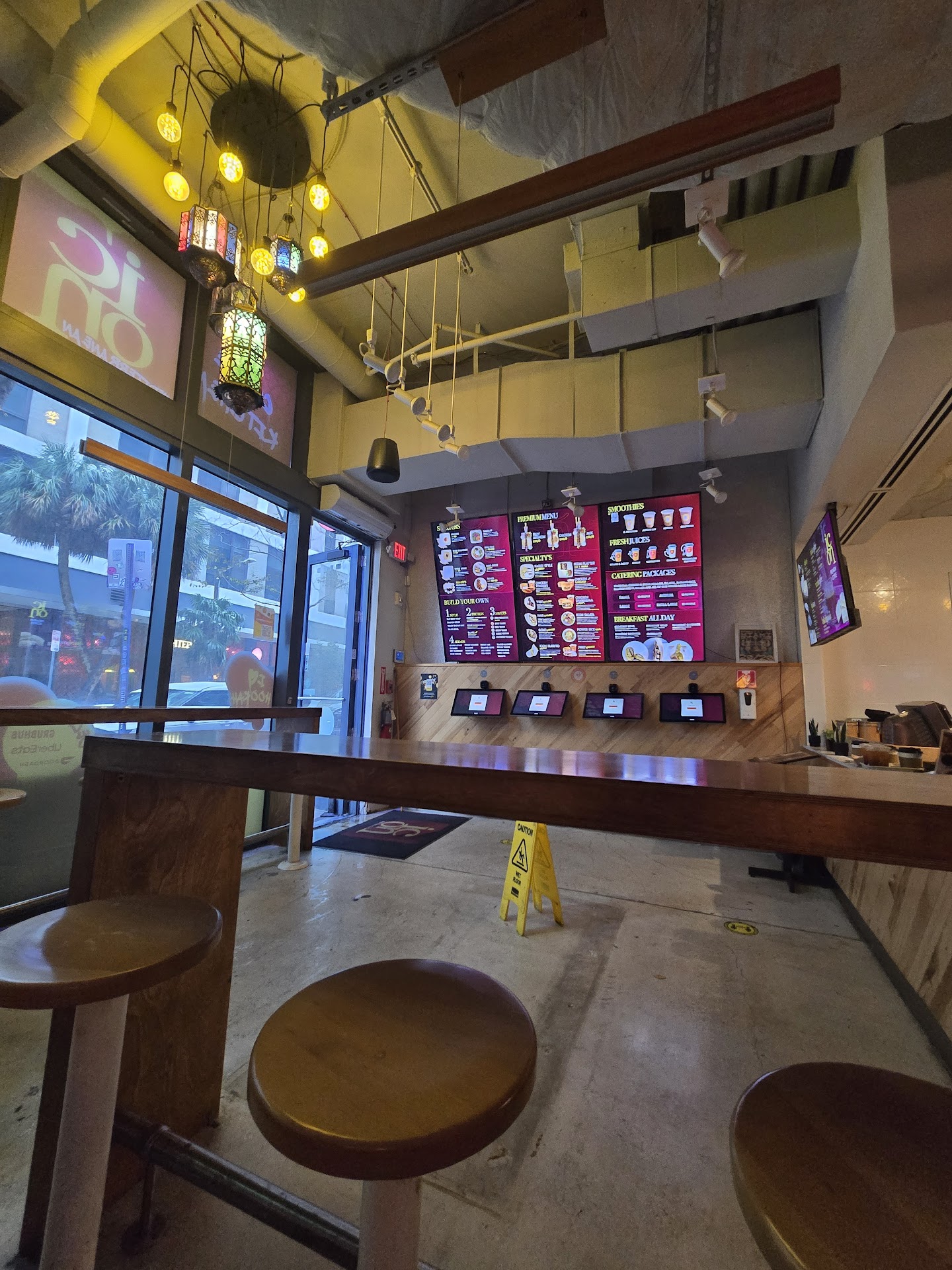Plus, the two guys working at the restaurant were so friendly! And the restaurant itself has a really cool atmosphere, with chill music, pillows on the benches, gorgeous Mediterranean/Moroccan lanterns, and even barstool seating. The ordering process is super easy, done through screens at the front of the restaurant, and then you pick up your food when your name is called. The kitchen is open so you can watch the entire process. The food is Mediterranean, with a few fusion Mediterranean-Tex/Mex dishes like the burrito and the shawarma quesadilla (which I only noticed after we had already ordered 😔). There are "specialties" as well as the option to create your own meal, including wraps and bowls.