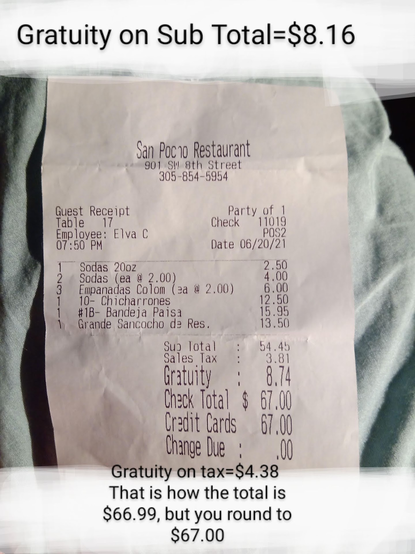 You know if the service was a 10-star service like the one Monserrate Restaurant in Coral Gables had I would gladly pay 20% gratuity. All waiters and or waitresses had a uniform and from the moment you enter the restaurant you were greeted by one of their personnel (waiter or not), then you were accompanied to a table, seated and a menu was given with a list of suggestions from the menu. NOT AT SAN POCHO!!!
