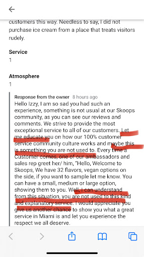 Read moreI had a terrible experience visiting Skoops. I am not a local and was in town for the 4th of July weekend. My young daughter initially was in the mood for ice cream. We were trying the flavors to decide which one she wanted when, the employee name JUANITA rudley interrupted me as I was asking her something about the ice cream flavor, and said to me “ I am talking, “ and pointed to her chest as she cut me off. I did respond, “you’re not going to talk to me like that!” When you are a customer service employee, when a customer is talking you do not interrupt the question being asked. Professionally, you allow the customer to speak. She then proceeded to tell me, “Well I am not going to help you then.” I then proceeded to ask for her managers number, when the other girl at the register proceeded to give me, JUANITA’S number as this girl proceeded to go to the back to pretend like she was the manager. They sat and laughed. This place is so unprofessional and employees need to be trained on their professionalism. It doesn’t matter if you are working at an ice cream place or the Ritz Carlton, you should not treat customers this way. Needless to say, I did not purchase ice cream from a place that treats visitors rudely. Please see attached their response. Still blaming it on the customer....