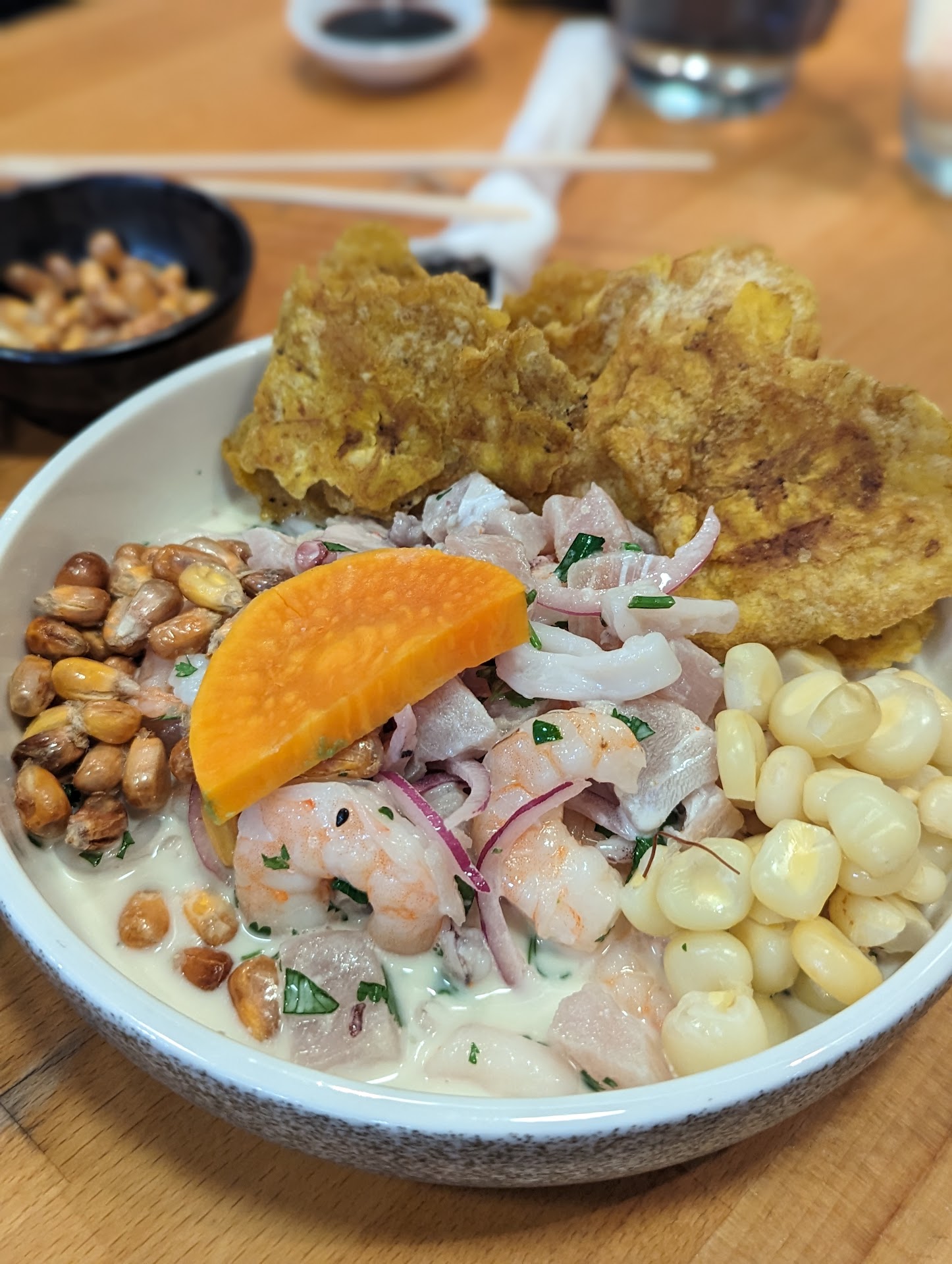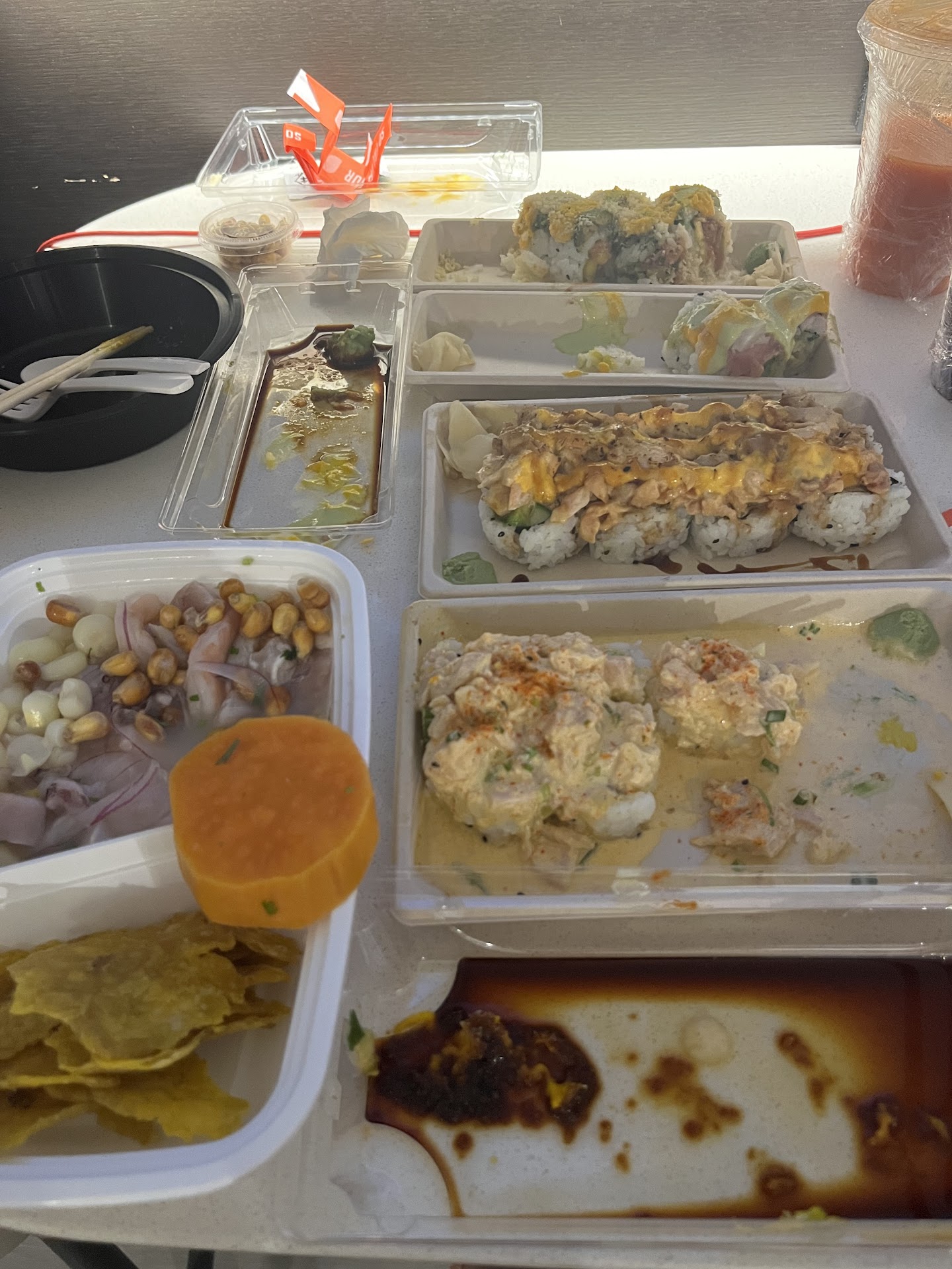 We finally ordered some food to share and went with these rolls: Lime Roll $9: crispy shrimp, cream cheese & salmon topped with thinly sliced lime Samba Roll $12.50: crispy shrimp, avocado & cucumber, topped with fresh tuna & wild caught white fish, finished with our crema de aji Amarillo & cilantro sauce TNT Roll $14.50: avocado, cucumber & real crab salad, topped w/ a heaping mixture of tuna, salmon & masago finished w/ spicy mayo & eel sauce
